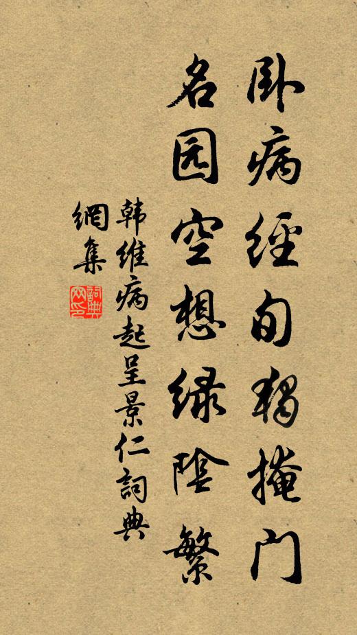 古詩文歷史字典書法欣賞書法字典國語詞典說文解字康熙字典古漢語字典臥病經旬獨掩門,名園空想綠陰繁韓維 《病起呈景仁》名句出處出自宋代韓維的《病起呈景仁》全文:臥病經旬獨掩門,名園空想綠陰繁。牡丹時節重來會,嘗記公非醉後言。韓維詩詞大全名句書法欣賞臥病經旬獨掩門,名園空想綠陰繁書法作品韓維名句,病起呈景仁名句名句推薦常聞武功貴時習,忘戰必危欲定國李廌《作塞上射獵行》溪橋人去幾黃昏吳文英《一翦梅(賦處靜以梅花枝見贈)》馬疾香幽,崖高人遠,微步觳紋生金庸《少年游 本意》綠樹菲菲紫白香,猶堪纏黍吊沉湘張蘊《楝花》人生苦浮脆,乃過金石堅陳宓《東湖四詠》掃地設菅席,酌酒老瓦盆陸游《甲子晴》斜髻嬌娥夜臥遲,梨花風靜鳥栖枝。唐寅《美人對月》須到三征處,堂堂謁帝閽黃滔《寄陳磻隱居》近天尺五哄車音,此復關門自古今曹勛《梁潔夫幽居林宇靚深畫幽邃不類貴第宛然山林》紙上香多蠹不成,昭容題處猶分明,令人惆悵難為情呂溫《上官昭容書樓歌》天將以夫子為木鐸釋智朋《偈傾一百六十九首》五兩劇奔星,檣烏疾飛鳥李紳《移九江(效何水部。余自九江及今周一紀矣)》我見諸相非相,天何不鳴善鳴林泳《雜述》並蒂輕黃宜淡淡,聯芳競秀巧盈盈曹勛《浣溪沙(西園賞牡丹,壽聖親見雙花,臥下皆未睹,折以勸酒,詞亦繼成)》涼多卻扇坐,睏倦把詩吟陳著《次韻弟觀留慈雲》詩詞推薦汾陰十首真宗〔宋代〕博碩者牲,載純其色。骨薦登俎,聿崇坤德。和成父過寶應縣韻袁說友〔宋代〕趁得花封八月涼,相家有子綰銅章。習華指日神京路,此地方知寶應祥。鷓鴣天黃機〔宋代〕細聽樓頭漏箭移。客床寒枕不勝敧。淒涼夜角偏多恨,吹到梅花第幾枝。人間闊,雁參差。相思惟有夢相知。謝他靈隱石鼓夷和尚贊釋智遇〔宋代〕面目嚴冷,狠氣如雲。攛掇翁木大,顛倒上樹。品藻果罵天,見地不親。咬牙齧齒,走石飛塵,鷲峰別有劫壺春。子虡當以十月離淝上喜而有作陸游〔宋代〕十月霜侵客子衣,片帆計已發淮淝。山林獨往我何敢?州縣徒勞兒未非。傳舍方寒索調護,里門終日待來歸。解裝次韻史院洪景盧檢詳館中紅梅周必大〔宋代〕紅羅亭深宮漏遲,宮花四面誰得知。蓬山移植自何世,國色含酒紛滿枝。初疑太真欲起舞,霓裳拂飾天然姿。又如意難忘劉辰翁〔宋代〕角動寒譙。看雨中燈市,雪意瀟瀟。星球明戲馬,歌管雜鳴刁。泥沒膝,舞停腰。焰蠟任風銷。更可憐、紅啼桃檻贈丹陽橫山周處士惟長李白〔唐代〕周子橫山隱,開門臨城隅。連峰入戶牖,勝概凌方壺。時作白紵詞,放歌丹陽湖。水色傲溟渤,川光秀菰蒲。當其和滕邁先輩傷馬章孝標〔唐代〕浮雲變化失龍兒,始憶嘶風噴沫時。蹄想塵中翻碧玉,尾休煙里掉青絲。曾同客舍吞饑渴,久共名場踏嶮巇。今日鶯梅堯臣〔宋代〕綠柳陰猶薄,黃鸝囀已清。年年舟上客,處處樹頭聲。仿佛佳人語,依稀太子笙。夕陽聽不足,飛入舊荒城。