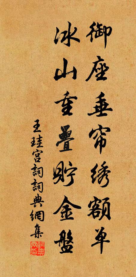 古詩文歷史字典書法欣賞書法字典國語詞典說文解字康熙字典古漢語字典御座垂簾繡額單,冰山重疊貯金盤王珪 《宮詞》名句出處出自唐代王珪的《宮詞》全文:御座垂簾繡額單,冰山重疊貯金盤。玉清迢遞無塵到,殿角東西五月寒。王珪詩詞大全名句書法欣賞御座垂簾繡額單,冰山重疊貯金盤書法作品王珪名句,宮詞名句名句推薦天涯望月自沾衣,江上何人復吹笛劉長卿《聽笛歌留別鄭協律》柳侯披衣笑,見我顏色溫杜甫《貽華陽柳少府》造物兒童作劇狂姬翼《鷓鴣天》歸來何薄暮,煙火照溪光梅堯臣《臘日出獵因游梅山蘭若》州人輕此樂,賴與汝曹期宋祁《同小姪珪璞溪上汎舟》壽陽眉恨妖嫵王奕《摸魚兒(肯堂欲惠書不果,借蕭彥和梅花韻見意)》麋鹿逢人雖未慣,猿猱聞鼓不須呼,歸來說與採桑姑杜甫《浣溪沙》雲氣潑濃墨,午窗變曛黃范成大《重陽後,半月天氣溫麗,忽變奇寒,晦日大雪》玉箸千行落,銀床一半空令狐楚《雜曲歌辭。長相思二首》消渴今如在,提攜愧老夫杜甫《別蘇徯(赴湖南幕)》翰林尚書宋公子,文採風流今尚爾黃庭堅《聽宋宗儒摘阮歌》攜取舊書歸舊隱,野花啼鳥一般春陳摶《歸隱》環看側睨驚相呀,儘是人間未曾著姚勉《贈棋翁挾二童皆高弈》閒攜小兒女,橋上看芙蕖楊萬里《休日》目斷京塵,何日聽鸞簫劉塤《西湖明月引(用白雲翁韻送客遊行都)》詩詞推薦石竹花齊己〔唐代〕石竹花開照庭石,紅蘚自稟離宮色。一枝兩枝初笑風,猩猩血潑低低叢。常嗟世眼無真鑒,卻被丹青苦相陷。誰為游長安諸寺聯句。大同坊雲華寺。偶聯句段成式〔唐代〕共入夕陽寺,因窺甘露門。 ——升上人清禪人請贊釋原妙〔宋代〕不識岩頭密啟處,剛言悟得仰山禪。遮場敗露難遮蓋,留與兒孫萬世傳。題墨梅圖王冕〔元代〕朔風吹寒冰作壘,梅花枝上春如海。清香散作天下春,草木無名藉光彩。長林大谷月色新,枝南枝北清無塵。廣平清明日獨酌王禹偁〔宋代〕一郡官閒唯副使,一年冷節是清明。春來春去何時盡,閒恨閒愁觸處生。漆燕黃鸝夸舌健,柳花榆莢斗身輕。脫衣早謁禹廟張伯玉〔宋代〕曉出五雲扃,皎日麗初宿霧斂嚴祠款靈秘。拂衽天風散,不聽{下缺}扶南曲歌詞五首王維〔唐代〕〔通典云:武德初,因隋舊制,奏九部樂,四曰扶南。唐書禮樂志云:天寶樂曲,皆以邊地名。自河西至者,有扶聲聲慢王沂孫〔宋代〕迎門高髻,倚扇清吭,娉婷未數西州。淺拂朱鉛,春風二月梢頭。相逢靚妝俊語,有舊家、京洛風流。斷腸句,試上元三絕張耒〔宋代〕江邊燈火似秋螢,哀怨山歌不可聽。自怪今春牢落甚,禪房止酒讀黃庭。寄遠其十李白〔唐代〕魯縞如玉霜。筆題月氏書。( 筆一作剪 )寄書白鸚鵡。西海慰離居。行數雖不多。字字有委曲。天末如見之。