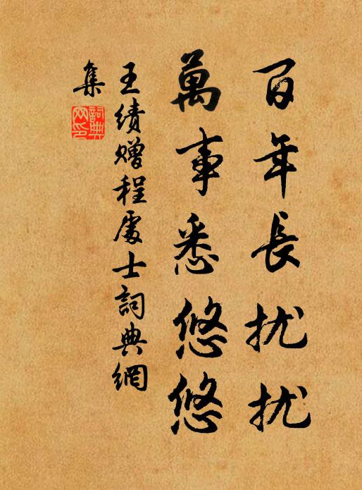 古詩文歷史字典書法欣賞書法字典國語詞典說文解字康熙字典古漢語字典百年長擾擾,萬事悉悠悠王績 《贈程處士》名句出處出自唐代王績的《贈程處士》全文:百年長擾擾,萬事悉悠悠。日光隨意落,河水任情流。禮樂囚姬旦,詩書縛孔丘。不如高枕枕,時取醉消愁。王績詩詞大全名句書法欣賞百年長擾擾,萬事悉悠悠書法作品王績名句,贈程處士名句名句推薦感時常激切,於己即忘情高適《酬河南節度使賀蘭大夫見贈之作》千回來繞百回看,蜂作婢蘇軾《天仙子》平生滿尊酒,斷此朋知展杜甫《八哀詩故秘書少監武功蘇公源明》聞誅一夫紂矣,未聞弒君也。孟子《孟子·梁惠王章句下·第八節》葉積池邊路,茶遲雪後薪鄭谷《故少師從翁隱岩別墅亂後榛蕪感舊愴懷遂有追紀》半逐風飛半隨水,半在枝、半落蒼苔白葛長庚《賀新郎》雪景鮮妍猶弄色,柳條蔥蒨已抽萌曾鞏《雪後》壁間幻出橫斜,祗欠紗窗明月葉樾《三里塘掐梅》玉台居上頭,連峰郁巑岏李壁《四月十八日送連帥母丘厚卿三聖院即事》寡妻泣帷荒,有子繼經術林景熙《哭薛榆漵同舍》青青石上歲寒枝,一寸岩前手自移王安石《蔣山手種松》婉膩詎如玉,凌風素雲裾蘇籀《題南圃一首》簌簌無風花自墮蘇軾《蝶戀花·暮春別李公擇》夢覺酒醒聞好句,帳空簟冷發余薰蘇軾《和張昌言喜雨》人間萬事都如夢,不如掛冠神武尋山川張九成《讀東坡疊嶂圖有感因次其韻》詩詞推薦頌古十首釋法薰〔宋代〕天地根無與我同,撥波求水漫勞功。時人見此花如夢,坐斷須彌信不通。次潘別駕韻汪莘〔宋代〕野店溪橋柳色新,千愁萬恨為何人。殷勤織就黃金縷,帶雨籠煙過一春。湖上作陸游〔宋代〕耳目聰明手足輕,應酬幽事未忘情。百年日向漁樵過,千里雲從幾席生。樽酒每招鄰父共,圖書時與小兒評。但余同皇甫侍御齋中春望見示之作獨孤及〔唐代〕望遠思歸心易傷,況將衰鬢偶年光。時攀芳樹愁花盡,晝掩高齋厭日長。甘比流波辭舊浦,忍看新草遍橫塘。因君九日送人李嘉祐〔唐代〕晴景應重陽,高台愴遠鄉。水澄千室倒,霧卷四山長。受節人逾老,驚寒菊半黃。席前愁此別,未別已沾裳。寄黃、劉二尊師韋應物〔唐代〕廬山兩道士,各在一峰居。矯掌白雲表,晞髮陽和初。清夜降真侶,焚香滿空虛。中有無為樂,自然與世疏。道尊寄鞋襪士人妻〔宋代〕細襪宮鞋巧樣新,殷勤寄語讀書人。好將穩步青雲上,莫向平康漫惹塵。虎溪林仲嘉〔宋代〕山闊青連海,溪長綠繞城。規模唐故郡,弦誦魯諸生。月桂堂喻良能〔宋代〕月桂堂何有,池清桂影橫。畫圖寧辦此,玉斧巧修成。入夜境逾妙,才秋風又生。饒陽岩石下,隱約欠分明。句石延年〔宋代〕春菜紅牙口,春盤黃雀花。