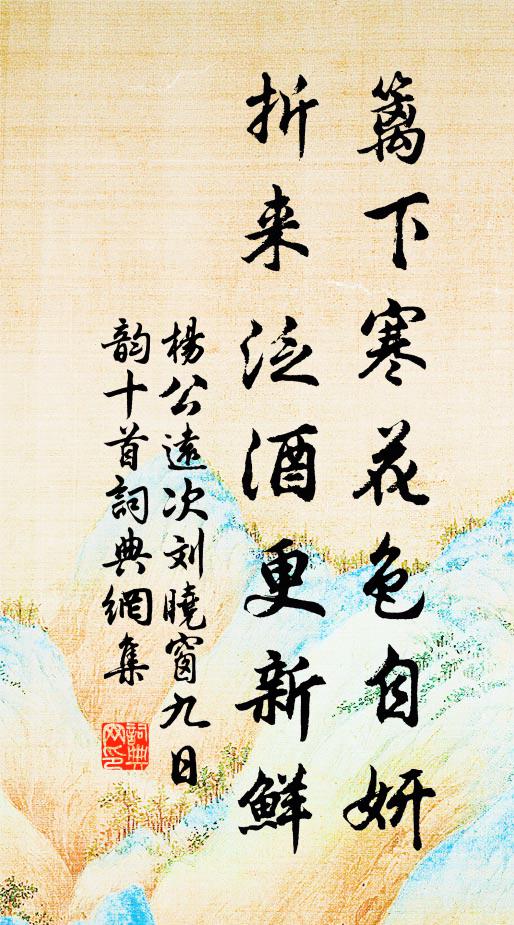 古詩文歷史字典書法欣賞書法字典國語詞典說文解字康熙字典古漢語字典籬下寒花色自妍,折來泛酒更新鮮楊公遠 《次劉曉窗九日韻十首》名句出處出自宋代楊公遠的《次劉曉窗九日韻十首》全文:籬下寒花色自妍,折來泛酒更新鮮。化工底事寧多巧,鑄出黃金滿地錢。楊公遠詩詞大全名句書法欣賞籬下寒花色自妍,折來泛酒更新鮮書法作品楊公遠名句,次劉曉窗九日韻十首名句名句推薦鮮鯽經年漬醽醁,團臍紫蟹脂填腹秦觀《寄蓴姜法魚糟蟹》詩人偏愛漁人樂,漁樂詩情一樣奇家鉉翁《隱者圖》小挹蘇耽鶴,同歌甯戚牛陳造《次韻高縉之二首》閣鈴無響晝輝遲,短髮山巾盡日欹宋庠《郡齋無訟春物寂然書所見》相傳五部學,更有一人成戴叔倫《送嵩律師頭陀寺》貳觴以獻,三變其終於邵《郊廟歌辭。釋奠武成王樂章。亞獻終獻》一掬陽泉堪作雨,數銖秋石欲成霜陸龜蒙《四月十五日道室書事寄襲美》蕭茅杜若亦莫分,唯取芳聲襲衣美梅堯臣《和石昌言學士官舍十題蘭》屋瓦自驚天自笑,丹毫圓折露華瀼龔自珍《已亥雜詩 52》昔歲為邦初未識,今朝休沐始相親皎然《奉酬李員外使君嘉祐蘇台屏營居春首有懷》世短奚足嘆,意多亦徒勞黎廷瑞《九日和陶》到處圖松樹,何曾忘卻山舒岳祥《送山甫還峽中》朅來游紺宇,歷玩同逡巡梅堯臣《和原甫同鄰幾過相國寺淨土院因觀楊惠之塑吳》張侯呼我飲,雲欲醉詩人趙蕃《張次律見招欲同一詩人飲既見乃新定遠令劉旦》壯士不可輕,相期在雲閣李白《游敬亭寄崔侍御(一本作登古城望府中寄崔侍御)》詩詞推薦思親五首謝枋得〔宋代〕九十萱親天下稀,吾王何在子何之。倚閭旦暮無他念,一片好心天得知。昭君怨(玩月)劉辰翁〔宋代〕月出東山之上。長憶御街人唱。恨我不能琴。有琴心。徙倚秋波平瑩。漸久玉肌清冷。待更下闌乾。起來看。夜宿青原寺感懷文天祥〔宋代〕松風一榻雨蕭蕭,萬里封疆夜寂寥。獨坐瑤琴悲世慮,君恩猶恐壯懷消。阮郎歸李祁〔宋代〕校書學士小蓬山。新參玉筍班。買花歸去五湖間。浣花龍尾灣。摸魚子馬熙〔元代〕買陂塘旋栽楊柳,飛橋檢校公務。當年題柱非無意,借用池墨玄雨。沱共渚。早有路潛通,海上三神嶼。歸來笑語臨江仙 黎江萬梅方吐,而予來沙,風雪十日許有壬〔元代〕十日惡風三尺雪,繁霜又滿人間。梅花誰與問平安。玉肌清似削,爭柰許多寒。夢繞琅璃江上路,竹籬茅舍青山。女幾山張耒〔宋代〕不復當年端正樓,多情猶問故宮游。山川不改繁華盡,須信人生一世浮。句章甫〔宋代〕今朝忽至前,郭索當炎伏。也知楚人饞,不待秋霜熟。剡溪道中五首韓元吉〔宋代〕平潮恰恰亂蛙鳴,斷送江南春雨晴。綠谷細看桑眼破,紫茸還見草心生。答任檢法孫應時〔宋代〕文字潮州更柳州,興來八表共神遊。驊騮隴孤長鳴日,鷹隼霜天得意秋。鼎鼎百年均昨夢,紛紛一世幾名流。為君