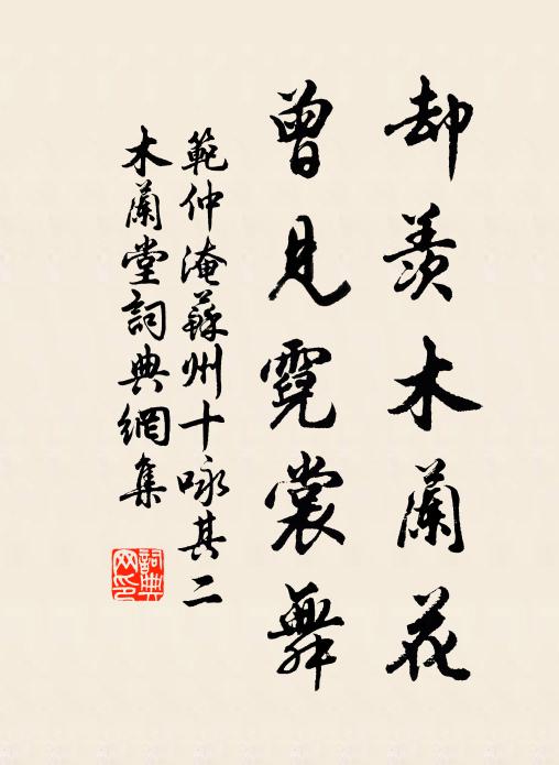 古詩文歷史字典書法欣賞書法字典國語詞典說文解字康熙字典古漢語字典卻羨木蘭花,曾見霓裳舞范仲淹 《蘇州十詠其二木蘭堂》名句出處出自宋代范仲淹的《蘇州十詠其二木蘭堂》全文:堂上列歌鍾,多慚不如古。卻羨木蘭花,曾見霓裳舞。范仲淹詩詞大全名句書法欣賞卻羨木蘭花,曾見霓裳舞書法作品范仲淹名句,蘇州十詠其二木蘭堂名句名句推薦泮水秋生藻荇涼,莫窗燈火亂螢光蘇轍《簡學中諸生》神仙疑有宅,魚鱉自為都錢昭度《憶具區》亦知身是客中客,試問朝來晴未晴丘葵《西興寺值雨次吳警齋先生韻》年來始逢君,恨不年再少陳普《純父家池雙頭蓮》平沙依雁宿,候館聽雞鳴常建《泊舟盱眙》應知譚笑還高謝,別就滄洲贊上仙司空圖《攜仙籙九首》前籌罄中悃,吉棟石基扃宋庠《參政東平侍郎誕辰紀德》萬山森玉寒如削,一騎奔塵去欲飛馮裦然《登齊山》疲薾安所逃,茅齋入僧定曾幾《盛夏東軒偶成五首》大小獨當三百陣,縱橫只用五千兵王建《贈田將軍》更坐上、其人冰雪史達祖《賀新郎(湖上高賓王、趙子野同賦)》黃犢鳥犍秧過候,雄蜂雌蝶菜花天憑澄《春日田園雜興》不知有去成知有,始信南泉喚作牛釋正覺《借借不借借》主人不語花能語李呂《一落索(送游君安解縣竹尉)》白賁黃中自不群,冷霜涼露伴靈均馬廷鸞《寄題程氏菊莊》詩詞推薦敬寄族弟唐十八使君杜甫〔唐代〕與君陶唐後,盛族多其人。聖賢冠史籍,枝派羅源津。在今氣磊落,巧偽莫敢親。介立實吾弟,濟時肯殺身。物白頌古二十七首釋雲賁〔宋代〕兩指爪開權撮起,一志頭上為吹開。這回不在身邊立,休說清風偏九垓。西江月(丹桂)曹勛〔宋代〕霞綺濃披翡翠,晨光巧上珊瑚。丹林偏許下清都。香占深岩煙雨。秋到九華宮殿,赭袍紅借繁珠。廣寒桂與世花殊故程將軍妻南陽郡夫人樊氏輓歌孫逖〔唐代〕德配程休甫,名高魯季姜。寵榮蒼玉珮,宴夢鬱金堂。白日期偕老,幽泉忽悼亡。國風猶在詠,江漢近南陽。寄題宇文中允所居司馬光〔宋代〕孤宦行直道,棲棲良可悲。誰能拂衣去,不待掛冠期。經史乃吾友,雲山為己知。世間青紫貴,盡付兩佳兒。送夔師楊校書解印還鄉二首項安世〔宋代〕高閒風度澹無營,靜密工夫久自增。太息家林惟獨鶴,向來西海說三鵬。橋沖不動千原獲,鼛鼓無聲萬杵登。道在題淮陰侯廟韋莊〔唐代〕滿把椒漿奠楚祠,碧幢黃鉞舊英威。能扶漢代成王業,忍見唐民陷戰機。雲夢去時高鳥盡,淮陰歸日故人稀。如何虎跑泉李喬〔宋代〕虎丘岩畔識泉根,股引瓊腴此處分。品絕未應容易得,地靈難使等閒聞。聲寒夜雜林間籟,氣潤朝隨谷口雲。十和銅雀硯趙文〔宋代〕老瞞智計籠天下,歌舞未終銅雀夜。可憐用破一生心,不及當時台上瓦。屑金作瓦費精神,那知身後旋成塵。流傳游龍門詩十二首潛溪韓維〔宋代〕李公舊林壑,及此與幾授。清泉流不竭,密竹老逾秀。我慚疏野人,來值溪花後。