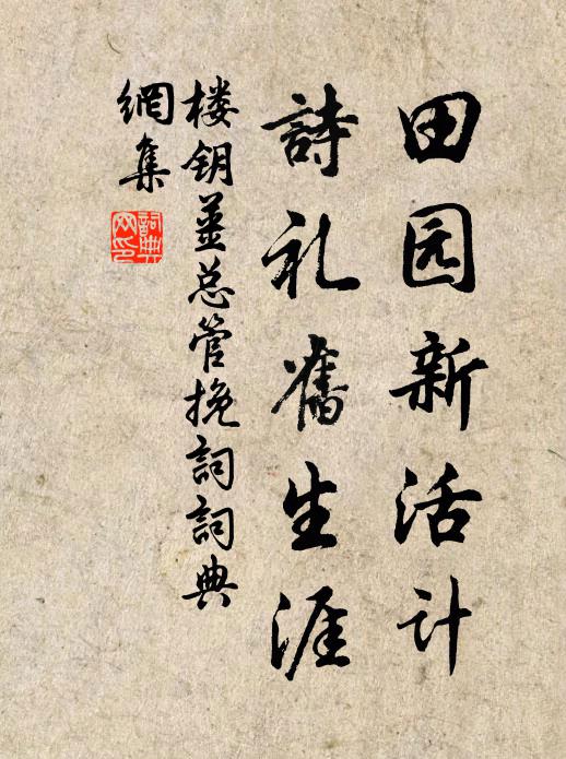 古詩文歷史字典書法欣賞書法字典國語詞典說文解字康熙字典古漢語字典田園新活計,詩禮舊生涯樓鑰 《姜總管輓詞》名句出處出自宋代樓鑰的《姜總管輓詞》全文:富盛俄遭變,艱難卻起家。田園新活計,詩禮舊生涯。仙桂應傳秀,庭蘭更茁芽。真歸了無恨,超徹妙蓮華。名句書法欣賞田園新活計,詩禮舊生涯書法作品樓鑰名句,姜總管輓詞名句名句推薦山上有頃田,岩洞多重複文師敬《龍多山》複列堪猛過,上為之切齒文同《諸葛豐》宣賜龍焙第一綱,殿上走趨明月璫楊萬里《謝木韞之舍人分送講筵賜茶》我道閒人勝貴人,儻來軒冕溪雲比仇遠《寄南仲》初投旱梅戈,忽整瀟湘枻張舜民《嶽麓寺》先賢食粥乞米,呆漢炊沙作糜劉克莊《竹溪再和余亦再作》堪笑兒童事業,華顛向誰語晁補之《過澗歇》杜鵑只管催歸去李處全《菩薩蠻(續前意,時溧陽之行有日矣)》我行縱有榮枯異,可乏新詩處處傳趙蕃《呈楊謹仲二首》歲暮天寒休復問,夢回酒理故難禁孫應時《和方與行韻》端坐窮城何所得,只收風月入新篇張耒《暮春贈陳器之》掀翻大地,打破虛空釋慧開《偈頌八十七首》絕艷生殊域,芳年入內庭文同《王昭君》老子所居隘,糞穢足嘔泄方回《雜興十二首》白首之攻,庶幾信今岳珂《徐浩謝賜書帖贊》詩詞推薦南柯子元好問〔金代〕粉澹梨花瘦,香寒桂葉顰。畫簾雙燕舊家春。曾是玉簫聲里斷腸人。澹澹催詩雨,遲遲入夢雲。武陵流水隔紅塵。過塗荊二山遇暗石梅堯臣〔宋代〕淮流兩山間,勢束秋漲急。聚石如伏兵,斂斂波下立。輕舟不可防,而況昧所習。暗值柂已毀,後者戒前及。同發相思曲(一作長相思)權德輿〔唐代〕少小別潘郎,嬌羞倚畫堂。有時裁尺素,無事約殘黃。鵲語臨妝鏡,花飛落繡床。相思不解說,明月照空房。頌古九首釋普信〔宋代〕收來輥去事方圓,獨許漁郎上鉤船。明月蘆花同一色,落霞孤鶩共遙天。別李十一五絕元稹〔唐代〕巴南分與親情別,不料與君床並頭。為我遠來休悵望,折君災難是通州。京城每與閒人別,猶自傷心與白頭。今日贈達西堂趙師秀〔宋代〕秋水數枝蓮,在師房畫這。固應通淨理,不復念生緣。舊願酬初滿,靈方許盡傳。閒詢曾住寺,如夢已茫然。麗人行楊維楨〔元代〕楊白花飛愁 * ,美人如華不勝春。錦韉馱起雙鳳縷,黃門挾飛五花雲。白日雷霆夾城道,樂遊園里春正好。就中長思仙侯善淵〔元代〕眉底眼,眼中精。精光輝輝好惺惺。現圓通,物外明。朝上帝,繞天庭。月華峰畔玩雲英。會金童,現玉清。秋日書懷孫應時〔宋代〕宦情都漠漠,愁思正悠悠。黃葉白苹渚,清風明月樓。歸歟想彭澤,老矣欠菟裘。行止君休問,吾生不擊舟。詠史上元帝陳普〔宋代〕事在兩疏心眼裹,身居石顯掌握中。師傅不能為作主,更生空自抱孤忠。