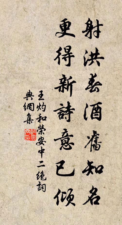 古詩文歷史字典書法欣賞書法字典國語詞典說文解字康熙字典古漢語字典射洪春酒舊知名,更得新詩意已傾王灼 《和榮安中二絕》名句出處出自宋代王灼的《和榮安中二絕》全文:射洪春酒舊知名,更得新詩意已傾。獨與劉伶敦契好,山王不敢豈人情。王灼詩詞大全名句書法欣賞射洪春酒舊知名,更得新詩意已傾書法作品王灼名句,和榮安中二絕名句名句推薦鼓鼙喧絕檄,部落擁將軍杜濬《樓雨》筋骸徽纆束,肺腑鼎鐺煎王安石《一日不再飯》睡起日高鶯囀,畫簾低卷,花影重重潘汾《玉蝴蝶》野鶴離群翔碧落,江鴻排字入黃昏董嗣杲《九日留彭澤》先生獨自笑,流鶯見朱敦儒《感皇恩》塵函欲開鏡尚掩,誰把白壁塗之泥王令《日蝕》呼酒犒三老,柁樓天正涼洪咨夔《送秦祠監還蜀二首》今因為說無生死,無可對治心更閒元稹《寄曇、嵩、寂三上人》不知獨何神,幻出忘世姿楊萬里《飲酒》夢回想像巫山雲,檐鵲似傳天上音趙汝鐩《漢離宮四時詞》姮娥剪就綠雲裳,待來步蟾宮與換汪存《步蟾宮》奇絕甚,歐公記,蔡公書劉克莊《六州歌頭(客贈牡丹)》與客攜壺上翠微黃庭堅《南鄉子》攖寧良自適,坎壈遂無伸韓元吉《故宮使待制侍郎陳公輓詞二首》王子緱山石殿明,白家詩句詠吹笙徐凝《和川守侍郎緱山題仙廟》詩詞推薦紫薇花二首袁燮〔宋代〕蒙茸曲徑紫薇花,幾載藤蘿巧蔽遮。暫借斧斤還舊觀,依前萬蕊吐新葩。傳言玉女(己未元夕)吳潛〔宋代〕眾綠亭前,都是郁蔥佳氣。越姬吳媛,粲珠鈿翠珥。紅消粉褪,幾許粗桃凡李。連珠寶炬,兩行緹騎。自笑衰翁,次韻郭方叔諸公借胡致堂賞梅至夜賦詩魏了翁〔宋代〕玄陰作秋冬,殺氣寓風雪。土深候蟲閉,山靜飛鳥絕。誰知無邊春,萬古長不滅。或暢然以舒,或凝然以結。或聚題閩中驛舍姚嗣宗〔宋代〕欲掛衣冠神武門,先尋水竹謂南村。卻將舊斬樓蘭劍,買得黃牛教子孫。野堂陸游〔宋代〕野堂蕭颯雪侵冠,歷盡人間行路難。病馬不收菸草暝,孤桐半落井床寒。長瓶濁酒猶堪醉,敗篋殘編更細看。此興早梅芳/喜遷鶯佚名〔宋代〕冰唯清,玉唯潤。清潤無風韻。此花風韻,自然清潤傳香粉。故應春意別,不使凡英恨。到春前臘後,長是寄芳信詩陳琳〔魏晉〕春天潤九野。卉木渙油油。紅華紛曄曄。發秀曜中衢。 筍蕨洪咨夔〔宋代〕小兒握固骨何弱,稚子著繃肌尚寒。豈不愛渠風味好,只應催我鬢毛殘。浣溪沙(次秀野酴醿韻)朱熹〔宋代〕壓架年來雪作堆。珍叢也是近移栽。肯令容易放春回。卻恐陰晴無定度,從教紅白一時開。多情蜂蝶早飛來。寄張直翁翁卷〔宋代〕若向筠州去,惟消一日寬。又無他事阻,自欲訪君難。露下秋山潔,鴻飛楚水寒。近詩凡幾首,專傳寫來看。