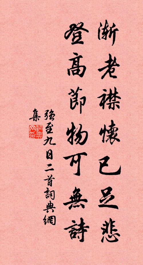 古詩文歷史字典書法欣賞書法字典國語詞典說文解字康熙字典古漢語字典漸老襟懷已足悲,登高節物可無詩強至 《九日二首》名句出處出自宋代強至的《九日二首》全文:漸老襟懷已足悲,登高節物可無詩。秋聲颯爽侵蓬鬢,晚意蕭條伴菊枝。故里江山尋好處,重陽樽酒負當時。天邊鴻雁隨南望,憶弟雙眸淚欲垂。名句書法欣賞漸老襟懷已足悲,登高節物可無詩書法作品強至名句,九日二首名句名句推薦迤衍魚監地,清明花格天陽枋《過下花》千車萬馬九衢上,回首看山無一人白居易《過天門街》君家不令君,千金僦別業李石《題王氏欵竹亭》且住百來年魏了翁《木蘭花慢(許侍郎奕生日十月二十四日)》盛在聰明稱帝舜,深於保輔是周公戴栩《上丞相壽》窮檐雙越燕,一再共年華宋祁《僑屋睹燕葺舊巢因贈》玻璃江頭春淥深,別時沄沄流到今范成大《玻璃江一首戲效陸務觀作》秩滿歸白雲,期君訪谷口錢起《贈東鄰鄭少府》尖翅名呼是玉蜂,千中難遇實難逢賈似道《論玉蜂形》莫驗昭華琯,虛傳甲帳神李商隱《昭肅皇帝輓歌辭三首》於皇上聖,臨御有赫曹勛《補樂府十篇夏後氏之樂歌》聞風無半面,折簡兩相知楊萬里《近故太師左丞相魏國文忠京公輓歌辭三首》人表何時,誰生過魯,願企高風慕浴沂王奕《沁園春(過彭澤發明靖節歸來之本心)》汝綱非堅牢,豈無風雨惡孫應時《和劉過夏蟲五詠蛛》六龍驅下飲洪濤,大作寒霖濟區宇陳襄《苦熱謠》詩詞推薦贈查仲文項安世〔宋代〕諸老更推挽,先生定別留。孰知廬阜趣,戰勝漢廷游。直自全高隱,寧當退急流。典刑能輩在,餘潤覓東邱。延之寄詩覓道院集,遣騎送呈,和韻謝之楊萬里〔宋代〕與君鬢髮摠星星,詩句輸君老更成。別去多時頻夢見,夜來一雨又秋生。故人金石情猶在,贈我瓊琚雪似清。誰把春日陪崔諫議櫻桃園宴皮日休〔唐代〕萬樹香飄水麝風,蠟熏花雪盡成紅。夜深歡態狀不得,醉客圖開明月中。和晏尚書出城口占四首宋祁〔宋代〕榔栗婆娑晝影圓,披襟凝眺此翛然。鸝留便作林間伴,正是麰黃椹紫天。次韻范參政書懷陸游〔宋代〕探梅方憶雪中歸,轉眼青青子滿枝。築圃漫為娛老計,劈牋又賦送春詩。乞身何日還初服?坐食終年媿聖時。睡起霜天曉角吳文英〔宋代〕煙林褪葉。紅藉遊人屧。十里秋聲松路,嵐雲重、翠濤涉。佇立。閒素箑。畫屏蘿嶂疊。明月雙成歸去,天風裡、無心道人梁長道以偈見寄次韻釋慧空〔宋代〕法從本有何曾有,心自元無不用無。試問大雄山下虎,何如千里踏人駒。謝監丞子長雪中四絕喻良能〔宋代〕萬玉妃來遣目迷,縞裙練帨顫鸞篦。令人卻憶桐川路,粉蘂垂垂照玉谿。雜劇·崔鶯鶯待月西廂記·張君瑞鬧道場(第一本)王實甫〔元代〕楔子(外扮老夫人上,開)老身姓鄭,夫主姓崔,官拜前朝相國,不幸因病告殂。只生得個小姐,小字鶯鶯。年一光澤朱君輓詞四首林亦之〔宋代〕迺翁飛旐過前村,一婦隨車一在門。何處人家有三柩,髑髏山下合銷魂。