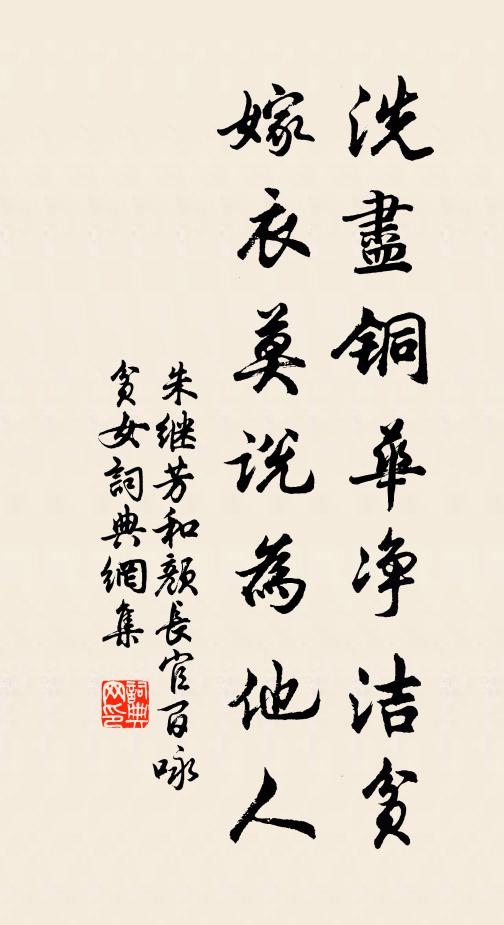 古詩文歷史字典書法欣賞書法字典國語詞典說文解字康熙字典古漢語字典洗盡銅華淨潔貧,嫁衣莫說為他人朱繼芳 《和顏長官百詠貧女》名句出處出自宋代朱繼芳的《和顏長官百詠貧女》全文:洗盡銅華淨潔貧,嫁衣莫說為他人。絕憐父母窮相守,不為金多賤卻身。朱繼芳詩詞大全名句書法欣賞洗盡銅華淨潔貧,嫁衣莫說為他人書法作品朱繼芳名句,和顏長官百詠貧女名句名句推薦富貴如朝露,英雄幾曉星俞桂《性拙》石間有書室,雪跡猶未陳何夢桂《和夾谷書隱先生寄題蛟峰石峽書院三十韻》陰磴層崖洞室寬,奇花異草幾多般陳岩《寶陀岩》從事龜山亦偶然,寧知長別恨終天毛直方《悼亡》瘦藤輕衲休便休,短焰殘芳續何續釋重顯《送智遷首座》一朝臨利害,暗捷同機舂李呂《清友堂為呂賓峰題》對座寂無言,泉聲如擊築陳世卿《游黃楊岩》袖羅斜舉動埃塵,明艷不勝春李曄《巫山一段雲》客愁能幾日?鄉路漸無多崔顥《晚入汴水》儂無喜事何須爾,往報槐花舉子忙王邁《紅蛛》推挽共作平山游,倚欄逸興浩莫收陳造《贈送行六子》公如驥騰驤,我類鱉跛蹇李處權《右司公致書顯上人並遺楮衾詩以贊之併簡都公》寶玉妻男宿業纏韓世忠《南鄉子》長望龍輈雷駕,憑仗簫鍾交鼓,賓日出扶桑汪莘《水調歌頭》腴田未可買,窮鬼卻須呼蘇軾《次韻和劉貢甫登黃樓見寄並寄子由二首》詩詞推薦述翠虛真人安樂法白玉蟾〔宋代〕收歛神光少默兢,頂門一路聚雲煙。且昇陽火烹金鼎,卻降靈泉灌玉田。交結只於牛渚外,分明正在鵲橋邊。功夫至後十日雪中觀梅楊萬里〔宋代〕小樹梅花徹夜開,侵晨雪片趁花回。即非雪片催梅發,卻是梅花喚雪來。琪樹橫枝吹腦子,玉妃乘月上瑤台。世間贈庸齋劉克莊〔宋代〕挾策端平偶見遺,不旋踵已遇嘉熙。雖聞棲楚叩墀語,不見陽城伏合時。下殿君能和富范,上房吾願讓夷夔。或疑次韻酬因勝老方岳〔宋代〕淺山如霽水連天,江北江南路幾千。入夢老親雙白髮,歸歟早及菊花前。哀國子黃助教梅堯臣〔宋代〕儒者務欲博,誦說窮各秋。衣裙未及解,含珠以見求。閩稱黃夫子,常恐學不流。有徒如浮萍,匝匝圍刳舟。聚書宿崔邵池陽別墅馬戴〔唐代〕楊柳色已改,郊原日復低。煙生寒渚上,霞散亂山西。待月人相對,驚風雁不齊。此心君莫問,舊國去將迷。詠白雪詩鮑照〔南北朝〕白珪誠自白。不如雪光妍。工隨物動氣。能逐勢方圓。無妨玉顏媚。不奪素繒鮮。投心障苦節。隱跡避榮年。蘭焚臨江仙王旭〔元代〕夢裡還家喧笑語,覺來春色他鄉。瀟瀟風雨入離腸。有詩還灑壁,無酒不傳觴。試問凌煙辛苦地,爭如畎畝南陽。飛練歌呈宋豳州宏文李新〔宋代〕玉娥入月雲鉤衣,素裙雪綃雲畔垂。三山老仙不倦舞,霓裳半在秋江舉。謝郎解取澄江擬,飛下高城化清泚,朝元浣溪沙·簌簌衣巾落棗花蘇軾〔宋代〕簌簌衣巾落棗花,村南村北響繅車,牛衣古柳賣黃瓜。酒困路長惟欲睡,日高人渴漫思茶,敲門試問野人家。
