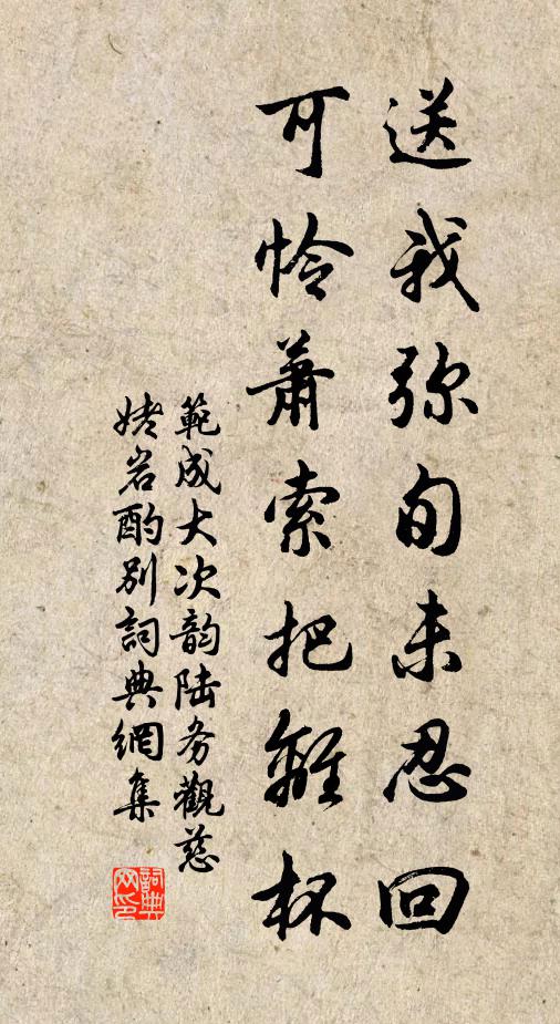 古詩文歷史字典書法欣賞書法字典國語詞典說文解字康熙字典古漢語字典送我彌旬未忍回,可憐蕭索把離杯范成大 《次韻陸務觀慈姥岩酌別》名句出處出自宋代范成大的《次韻陸務觀慈姥岩酌別》全文:送我彌旬未忍回,可憐蕭索把離杯。不辭更宿中岩下,投老餘年豈再來!范成大詩詞大全名句書法欣賞送我彌旬未忍回,可憐蕭索把離杯書法作品范成大名句,次韻陸務觀慈姥岩酌別名句名句推薦不向神林乞雨晴,天公自解相西成陸游《有年》僧儀又入清流品,卻恐前生是許詢張祜《題畫僧二首(前篇一作酬信上人贈張僧繇畫僧)》功名誰使連三捷,身世何緣得兩忘蘇軾《和章七出守湖州二首》黃道月斜風細細,紫壇天曉露霏霏王禹偁《南郊大禮詩》新霽田園處,夕陽禾黍明司空圖《河上二首》相思暮煙起,片月過前灘張九成《癸亥初到嶺下寄汪聖錫》事無大小成者少,談說治亂何區區洪邁《宿禪寂院》詎聞輕宋璞,可要逐秦鞭宋庠《醜石》別路餘千里,深恩重百年王勃《秋日別王長史》湖山明月夜,風露菊花時徐璣《喜奭上人至》但覺高歌有鬼神,焉知餓死填溝壑杜甫《醉時歌(贈廣文館博士鄭虔)》飛流濺沫瀑爭礲,電擊雷驚江落洪趙蕃《自桃川至辰州絕句四十有二》剪出冰花,偏愛臘前看李曾伯《江神子/江城子》曉隨雲雨歸何處,還是襄王夢覺愁權德輿《贈友人(時友人新有別恨者)》玉局共藏機,瑤琴越操縵刁繹《雪後游琅玡山與韋驤聯句》詩詞推薦游山陸游〔宋代〕一生萬里著行縢,抖擻塵埃尚未能。不怕語音時帶剡,敢辭生計略如僧。疏梅漸動清溪曲,霽雪遙看古塔層。喚起堅老住廣福袁說友〔宋代〕高僧七十未龍鍾,飛錫飄然百里中。正欲逢場施手段,不妨臨老入花叢。把茅便可傳宗旨,一缽由來是祖風。直要和太師相公秋興十首夏竦〔宋代〕亭臯危葉乍經霜,過盡驚鴻落吹長。間上層樓待初月,方壺殘漏下三商。高景庵讀舊題有感范成大〔宋代〕莓苔風雨舊詩留,十七年前鬢未秋。岩桂拂雲篁竹拱,樹猶如此一搔頭。呈慧力然老趙蕃〔宋代〕慧力知名寺,混融開士英。宗乘真繼祖,翰墨亦兼名。更用終何得,悠然聽此生。懷哉躬井碓,永絕世塵攖。芙蓉嶺吳黯〔宋代〕每度芙蓉嶺,愁眉慘不開。有命終須過,無災不再來。烏衣巷曾極〔宋代〕吳兵曾駐黑雲都,江左夷吾此卜居。休把烏衣輕馬巷,懸鶉結駟總丘墟。送喬仝寄賀君六首蘇軾〔宋代〕舊聞父老晉郎官,已作飛騰變化看。聞道東蒙有居處,願供薪水看燒丹。車中聞人說豀澗如水晶色口占一絕張鎡〔宋代〕澗水流如活水晶,道傍一語喚人醒。山林未必渠能說,說著山林便可聽。十月桃李彌遜〔宋代〕一枝花三四,弄疏英秀色,特地生寒。刻楮三年,謾夸煮石成丹。梨花帶雨難並,似玉妃、寂寞微潸。瑤台空闊,