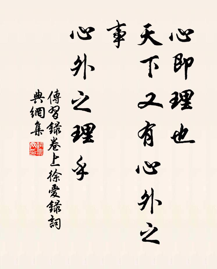 〕愛問:“‘知止而後有定’,朱子以為‘事事物物皆有定理’,似與先生之說相戾”。先生曰:“於事事物物上求至善,卻是義外也。至善是心之本體。只是明明德到至精至一處便是。然亦未嘗離卻事物。本注所謂‘盡夫天理之極,而無一毫人慾之私’者,得之”。〔3〕愛問:“至善只求諸心。恐於天下事理,有不能盡”。先生曰:“心即理也。天下又有心外之事,心外之理乎”?愛曰:“如事父之孝,事君之忠,交友之信,治民之仁,其間有許多理在。恐亦不可不察”。先生嘆曰:“此說之蔽久矣。豈一語所能悟?今姑就所問者言之。且如事父,不成去父上求個孝的理。事君,不成去君上求個忠的理;交友治民,不成去友上民上求個信與仁的理。都只在此心。心即理也。此心無私慾之蔽,即是天理。不須外面