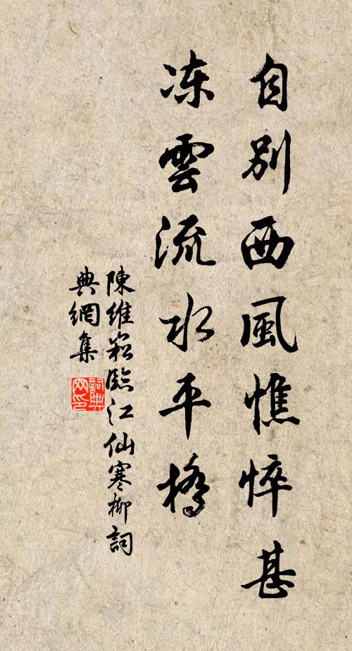 自別西風憔悴甚,凍雲流水平橋。並無黃葉伴飄飄。亂鴉三四點,愁坐話無憀。