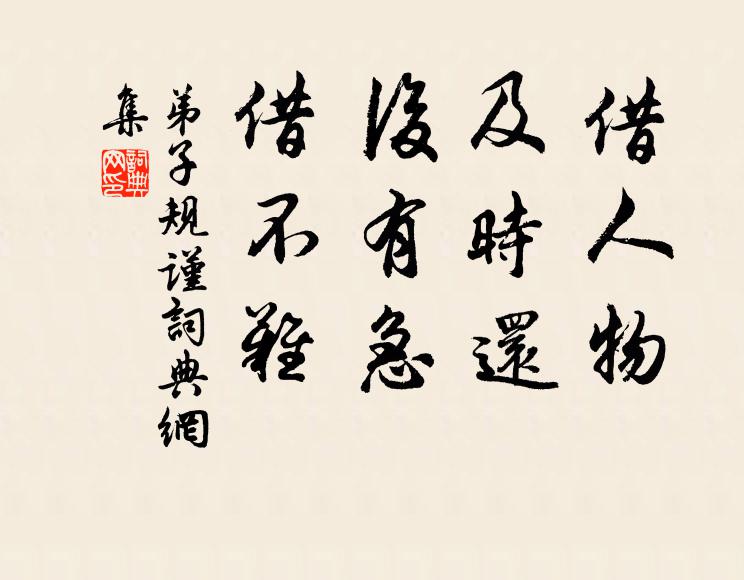古詩文歷史字典書法欣賞書法字典國語詞典說文解字康熙字典古漢語字典借人物,及時還。後有急,借不難。李毓秀 《弟子規·謹》名句出處摘自《弟子規·謹》解釋:借用他人的物品用完了要立刻歸還;別人借用你的東西,如果有,一定不要吝嗇。原文摘要:醉,最為醜。步從容,立端正。揖深圓,拜恭敬。勿踐閾,勿跛倚。勿箕踞,勿搖髀。緩揭簾,勿有聲。寬轉彎,勿觸棱。執虛器,如執盈。入虛室,如有人。事勿忙,忙多錯。勿畏難,勿輕略。斗鬧場,絕勿近。邪僻事,絕勿問。將入門,問孰存。將上堂,聲必揚。人問誰,對以名。吾與我,不分明。用人物,須明求。儻不問,即為偷。借人物,及時還。後有急,借不難。名句書法欣賞借人物,及時還。後有急,借不難。書法作品李毓秀名句,弟子規·謹名句名句推薦燕子不知人去也,飛認闌乾。韓疁《浪淘沙·莫上玉樓看》疲馬山中愁日晚,孤舟江上畏春寒。張謂《杜侍御送貢物戲贈》獨寫菖蒲竹葉杯,蓬城芳草踏初回。湯顯祖《午日處州禁競渡》被冷香消新夢覺,不許愁人不起李清照《念奴嬌·春情》春水滿四澤,夏雲多奇峰。陶淵明《四時》下謀上以術,術有窮者以力。來俊臣《羅織經·謀劃卷第九》人學始知道,不學亦徒然。佚名《增廣賢文·上集》篤志而體,君子也。荀子《荀子·修身》凡戰,所謂攻者,知彼者也。佚名《百戰奇略·第四卷·攻戰》我是人間惆悵客,知君何事淚縱橫,斷腸聲里憶平生。納蘭性德《浣溪沙·殘雪凝輝冷畫屏》不鳴則已,一鳴驚人。司馬遷《滑稽列傳》風回雲斷雨初晴,返照湖邊暖復明。白居易《南湖早春》傷心千里江南,怨曲重招,斷魂在否?吳文英《鶯啼序·春晚感懷》過也,人皆見之;更也,人皆仰之。孔子弟子《論語·子張篇》明日客程還幾許,沾衣況是新寒雨。納蘭性德《蝶戀花·又到綠楊曾折處》詩詞推薦戲從豐陽喻長官覓筍王禹偁〔宋代〕春來春筍滿豐陽,只把盤餐勸孟光。犀角錦文雖可惜,也須分惠紫微郎。銅雀妓袁暉〔唐代〕君愛本相饒,從來似舞腰。那堪攀玉座,腸斷望陵朝。怨著情無主,哀凝曲不調。況臨松日暮,悲吹坐蕭蕭。傳經院壁畫松(一本題上有西蜀淨眾寺五字)鄭谷〔唐代〕危根瘦盡聳孤峰,珍重江僧好筆蹤。得向遊人多處畫,卻勝澗底作真松。鷓鴣天石孝友〔宋代〕玉燭調元黍律勻。迎長嘉節屬芳辰。雲如惜雨鉤牽雪,梅不禁風漏泄春。天意好,物華新。偷閒贏取酒邊身。太平次韻黃無悔惜梅陳師道〔宋代〕雪擁寒門鵲不來,江南春信小遲回。遙知詩力生春早,一抹江梅趁眼開。歲暮舟居臥病懷寄金陵和上人賀鑄〔宋代〕野泊歲雲暮,念歸期正賒。津童為過客,商舶是鄰家。雪密魚依罧,潮回蚌委沙。南州人健否,不寄早梅華。和丁大卿韻姜特立〔宋代〕久回俗駕向山中,無復詩騷見古風。方喜故人千里至,更容清夜一尊同。賓筵談笑知無敵,筆力追陪愧未工。自古富陽陸路權德輿〔唐代〕又入亂峰去,遠程殊未歸。煙蘿迷客路,山果落征衣。欹石臨清淺,晴雲出翠微。漁潭明夜泊,心憶謝玄暉。和何子應游金璧池二首郭印〔宋代〕徜徉清水曲,盼巒綠楊邊。欲並師商席,同登傅說船。萬荷齊舞扇,一葦獨行天。滿目江湖趣,無勞涉大川。洛陽橋三首劉克莊〔宋代〕周時宮室漢時城,廢址遺基劃已平。乍見橋名驚老眼,南州安得有西京。