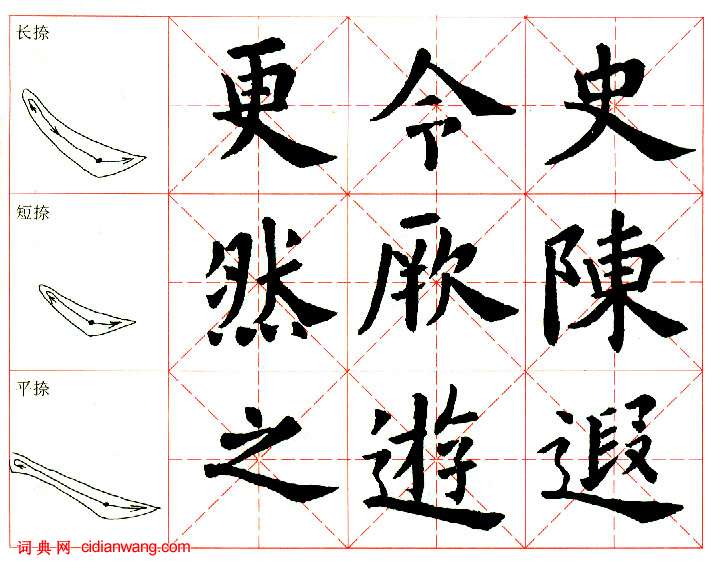 歐體的捺畫通常較直,也有少數呈微弧狀,至尾端頓筆前與頓筆後的過渡含蓄自然,一氣呵成。