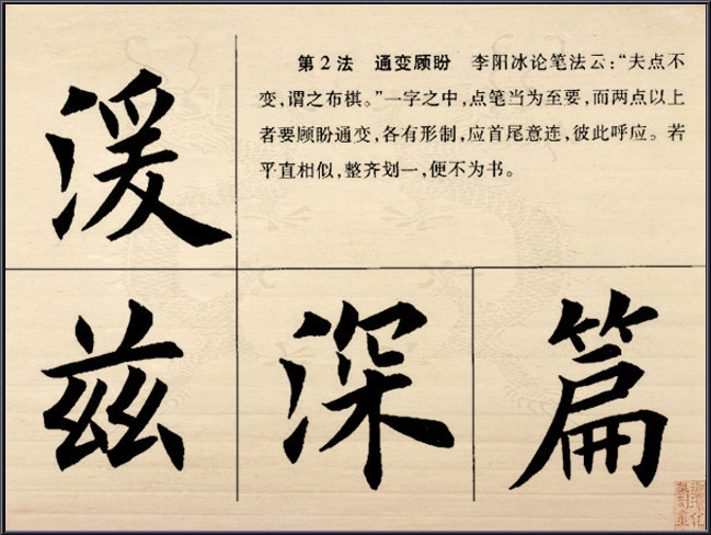 李陽冰論筆法云:“夫點不變,謂之布棋。”一字之中,點筆當為至要。而兩點以上者要顧盼通變,各有形制,應首尾意連,彼此呼應。若平直相似,整齊劃一,便不為書。見下圖: