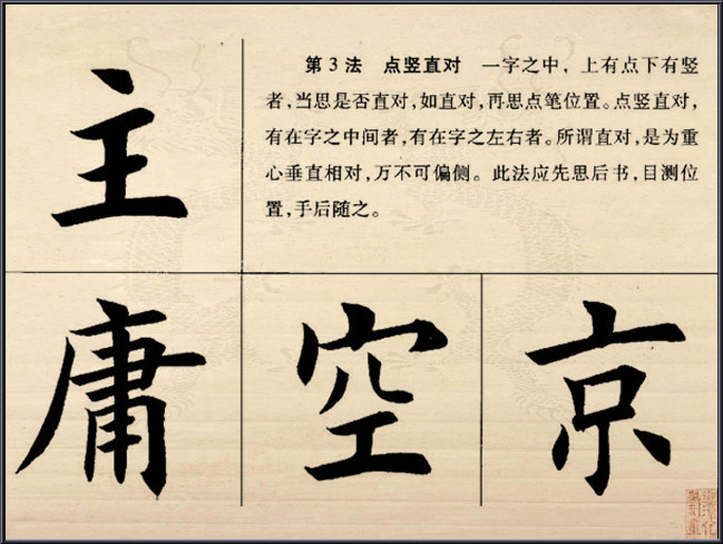 一字之中,上有點下有豎者,當思是否直對。如直對,再思點筆位置。點豎直對,有在字之中間者,有在字之左右者。所謂直對,是為重心垂直相對,萬不可偏側。此法應先思後書,目測位置,手後隨之。見下圖: