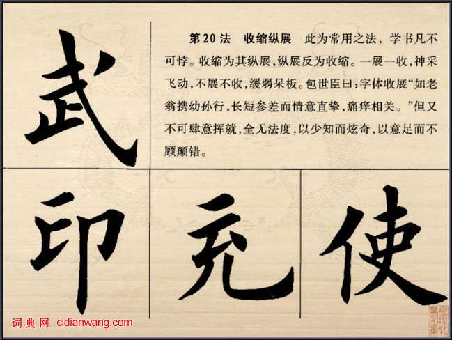 第二十法: 收縮縱展。此為常用之法,學書凡不可悖。收縮為其縱展,縱展反為收縮。一展一收,神采飛動,不展不收,緩弱呆板。包世臣曰:字型收展“如老翁攜幼孫行,長短參差而情意直摯,痛癢相關”,但又不可肆意揮就,全無法度,以少知而炫奇,以意足而不顧顛錯。見下圖: