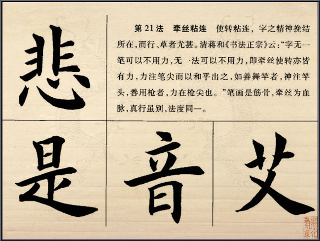 第二十一法: 牽絲粘連。使轉粘連,字之精神挽結所在,而行、草者尤甚。清蔣和《書法正宗》云:“字無一筆可以不用力,無一法可以不用力,即牽絲使轉亦皆有力,力注筆尖而以和平出之,如善舞竿者,神注竿頭,善用槍者,力在槍尖也。”筆畫是筋骨,牽絲為血脈,真行雖別,法度同一。見下圖:
