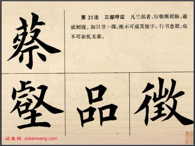 第二十五法: 三部呼應。凡三部者,應朝揖顧盼,避就相迎。如只書一部,絕不可成其獨字。行書急就,也不可雜亂無章。見下圖: