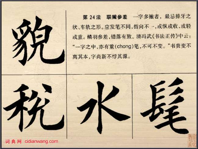 第二十四法: 聯撇參差。一字多撇者,最忌排牙之狀、車軌之形。應發筆不同,指向不一,或縱或收,或輕或重。鱗羽參差,錯落有致。清馮武《書法正傳》中云:“一字之中,亦有重筆,不可不變。”書貴變不離其本,字尚新不悖其源。見下圖: