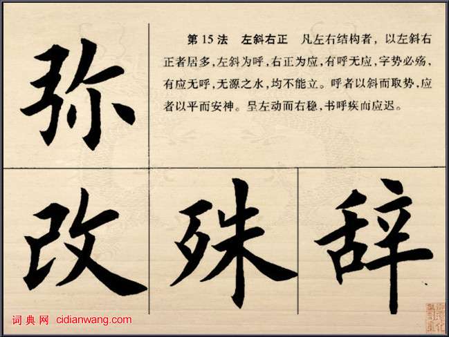 第十五法: 左斜右正。凡左右結構者,以左斜右正者居多,左斜為呼,右正為應,有呼無應,字勢必殤,有應無呼,無源之水,均不能立。呼者以斜而取勢,應者以平而安神。呈左動而右穩,書呼疾而應遲。見下圖: