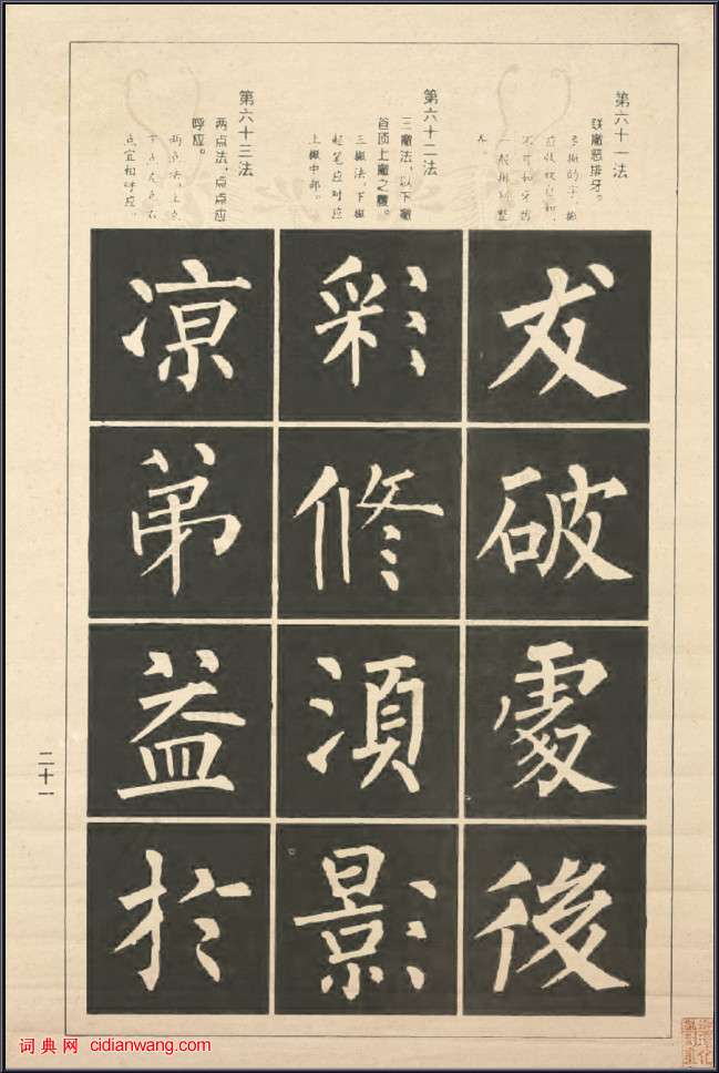 資源下載魏晉書法唐朝書法宋朝書法元朝書法明朝書法清朝書法近現代書法字典網>> 歷代書法>> 書法教程>> 柳公權楷書間架結構100法(21)正文 柳公權楷書間架結構100法(21)作者:不詳 書體:楷書 六十一法:聯撇惡排牙。多撇的字,撇應收放自如,不可如牙齒一般排列整齊。六十二法:三撇法,以下撇首頂上撇之腹。三撇法,下撇起筆應對應上撇中部。六十三法:兩點法,點點應呼應。兩點法,上點下點左點右點宜相呼應。首 頁 上一頁 17 18 19 20 21 22 23 24 25 26 下一頁 尾 頁相關文章:米芾行書《褚遂良摹蘭亭序跋贊》 (行書)米芾《褚遂良摹蘭亭序跋贊》 紙本 24 X 47.5cm 北京故宮博物院藏。 釋...宋湘《行書軸》 (行書)宋湘《行書軸》,廣東省博物館藏。釋文:籠土地於行內,挫萬物於筆端。精湛的楷書,是這樣寫成的!漢字都有其特定的形態。筆畫的長短疏密、偏旁的大小高低,都有一定的安排處置,這就叫...王羲之蘭亭序,也有“瑕疵”馮承素摹王羲之《蘭亭序》書法家:王羲之《蘭亭序》三個最經典的摹本,分別出自唐代書...文徵明小楷《千字文》 (小楷)文徵明諸體皆能,而且皆有所成。其篆書師法李陽冰,一筆一畫不出李氏左右,書風溫和,...行草書法的章法十忌1.無畫眼。全篇顯平,無神采,終下人一等。 2.無大破。全篇無大的留白,無破則無...蔡襄《安道帖》 (行書)【釋文】襄再拜。自安道領桂管,日以因偱,不得時通記牘,愧詠無極。中間辱書,頗知動...倪瓚小楷題陳惟允《孟郊詩意圖》 (小楷)題陳惟允《孟郊詩意圖》1365 台北故宮博物院藏釋文:慈母手中線,遊子身上衣。臨...魯迅行書《自錄舊作贈柳亞子》 (行書)魯迅行書《自錄舊作贈柳亞子》238×53.8cm 1932年 北京魯迅博物館藏...李邕行書《婆羅樹碑記》 (行書)李邕《婆羅樹碑記》 《婆羅樹碑記》立於於淮安(今江蘇淮陰)府衙。碑建於開元十...