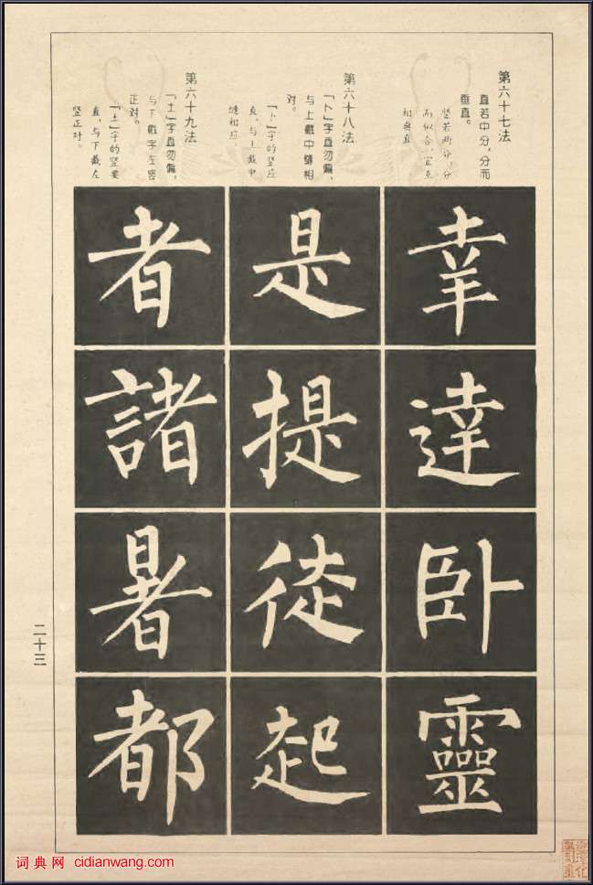 資源下載魏晉書法唐朝書法宋朝書法元朝書法明朝書法清朝書法近現代書法字典網>> 歷代書法>> 書法教程>> 柳公權楷書間架結構100法(23)正文 柳公權楷書間架結構100法(23)作者:不詳 書體:楷書 六十七法:直若中分,分而垂直。豎若兩分,分而似合,宜互相垂直。六十八法:[卜]字宜直勿偏,與上截中縫相對。[卜]字的豎應直,與上截中縫相應。六十九法:[土]字直勿偏,與下截字左豎正對。[土]字的豎要直,與下截左豎正對。首 頁 上一頁 19 20 21 22 23 24 25 26 27 28 下一頁 尾 頁相關文章:中國書法起源、發展及巔峰文字的出現,是人類進入文明時代的標誌.人們開始交流,文化得以傳承.大家一起關注,...米芾《紫金研帖》 (行書)【釋文】蘇子瞻攜吾紫金研去。囑其子入棺。吾今得之。不以斂。傳世之物。豈可與清淨圓...孫杕·跋藍瑛《仿黃公望山水卷》 (行書)孫杕跋藍瑛《仿黃公望山水卷》,行書。班惟志·題《雪江圖》 (行草)班惟志題《雪江圖》,行草書。班惟志,元(約公元一三三o年前後在世)字彥功(一作彥...田英章《大楷九成宮醴泉銘》 (楷書)《九成宮醴泉銘》(簡稱《醴泉銘》、《九成宮》、《九成宮碑》),是唐初的一座名碑,...張瑞圖草書《今春花開七言詩軸》 (草書)張瑞圖《今春花開七言詩軸》絹本草書 187×48cm 朵雲軒藏釋文:今春花開委...郭畀《陸游自書詩卷跋》 (行書)郭畀《陸游自書詩卷跋》,行書,遼寧省博物館藏。《自書詩卷》為陸游告退歸里時所作,...顏真卿楷書《陋室銘》集字 (楷書)顏真卿陋室銘釋文:山不在高,有仙則名。水不在深,有龍則靈。斯是陋室,惟吾德馨。苔...痛失海外的敦煌瑰寶!一名號一蓮花一佛像佛說賢劫千佛名經殘卷一名號一蓮花一佛像此卷為英國人斯坦因於19...林散之《隸書俾壽八言聯之一》 (隸書)林散之《隸書俾壽八言聯之一》132×31 三十年代 林生若藏釋文:俾壽而藏書傳...