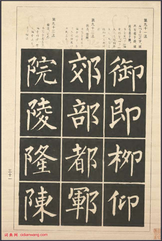 邑法,宜展。書寫含有右[ 阝]偏旁的字,右[ 阝]盡可伸展以平衡左右。九十三法:阜法,讓右。書寫含有左[ 阝]偏旁的字,整個偏旁讓右,左[ 阝]縮讓。