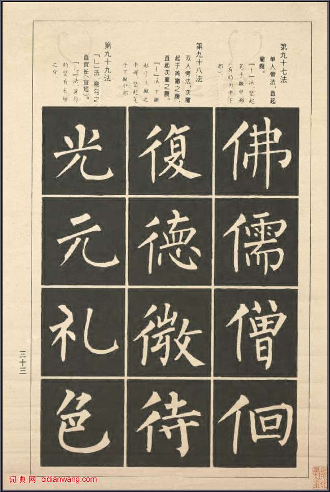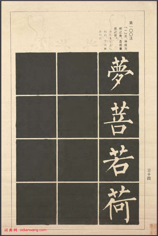 豎彎勾法,彎勾之直宜長(宜短)。豎彎勾法,彎勾的豎有長短之分。一百法:[ 艹 ]法,畫成對稱之勢,直成撇捺之狀。書寫草字頭結構,豎成撇捺對應。作者:不詳 書體:楷書