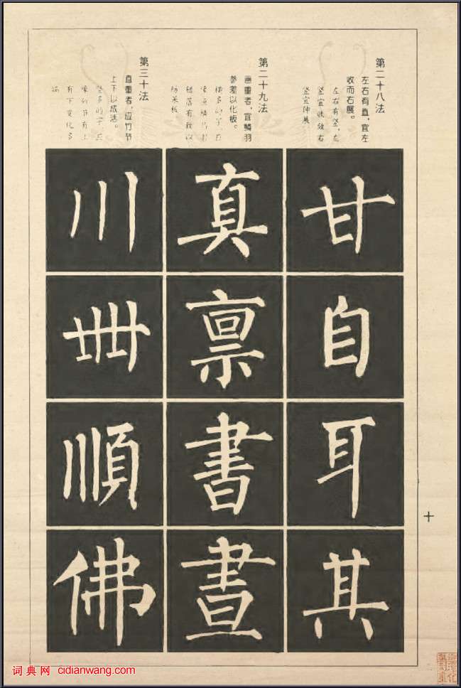 書法欣賞魏晉書法唐朝書法宋朝書法元朝書法明朝書法清朝書法近現代書法字典網>> 歷代書法>> 書法教程>> 柳公權楷書間架結構100法(10)正文 柳公權楷書間架結構100法(10)作者:不詳 書體:楷書 二十八法:左右有直,宜左收而右展。左右有豎,左豎宜收斂,右豎宜伸展。二十九法:畫重者,宜鱗羽參差以化板。橫多的字,應像魚鱗鳥羽錯落有致以防呆板。三十法:直重者,應竹節上下以成活。豎多的字,應向竹節有上有下變化多端。首 頁 上一頁 6 7 8 9 10 11 12 13 14 15 下一頁 尾 頁相關文章:包世臣行書《錄坡公語立軸》 (行書)包世臣《錄坡公語立軸》紙本行書 135.2×38.5cm 北京故宮博物院藏【資...顏真卿楷書《李玄靖碑》 (楷書)《李玄靖碑》,全稱為《有唐茅山玄靖先生廣陵李君碑銘並序》。碑原立在江蘇句容縣茅山...陳繼儒《行書五言詩》扇面 (行書)陳繼儒《行書五言詩》扇面 台北故宮博物院藏陳繼儒書法學習宋代蘇軾、米芾,用筆駿快...文徵明行書《致華氏手札冊》 (行書)文徵明尺牘書法精品《致華氏手札冊》八通,七通致華泮,一通致華雲。無錫博物館藏品。...王寵草書《自書五憶歌》 (草書)王寵《自書五憶歌》 紙本 草書 29.3×294.7厘米。台北故宮博物院藏。 ...圖解孫過庭《書譜》筆法——起筆和收筆【導讀】我們知道,一個筆畫的完成,需要起筆、行筆、收筆三個過程,大到橫豎撇捺,小...康有為行書《錄焦氏易林句中堂》 (行書)康有為《錄焦氏易林句中堂》 紙本行書 110cm×54cm釋文:元利孔福,神...董其昌行書《仿米書詩軸》 (行書)董其昌《仿米書詩軸》 南通博物苑藏釋文:家山只在東流水,每到橋時眼便東。昨夜南宮...王寵小楷《為海濱先生書五言詩扇》 (小楷)王寵《為海濱先生書五言詩扇》 扇面 箋本 19×54cm 匡時2007春季藝術...史可法·行書手札一 (行書)史可法《行書手札》。