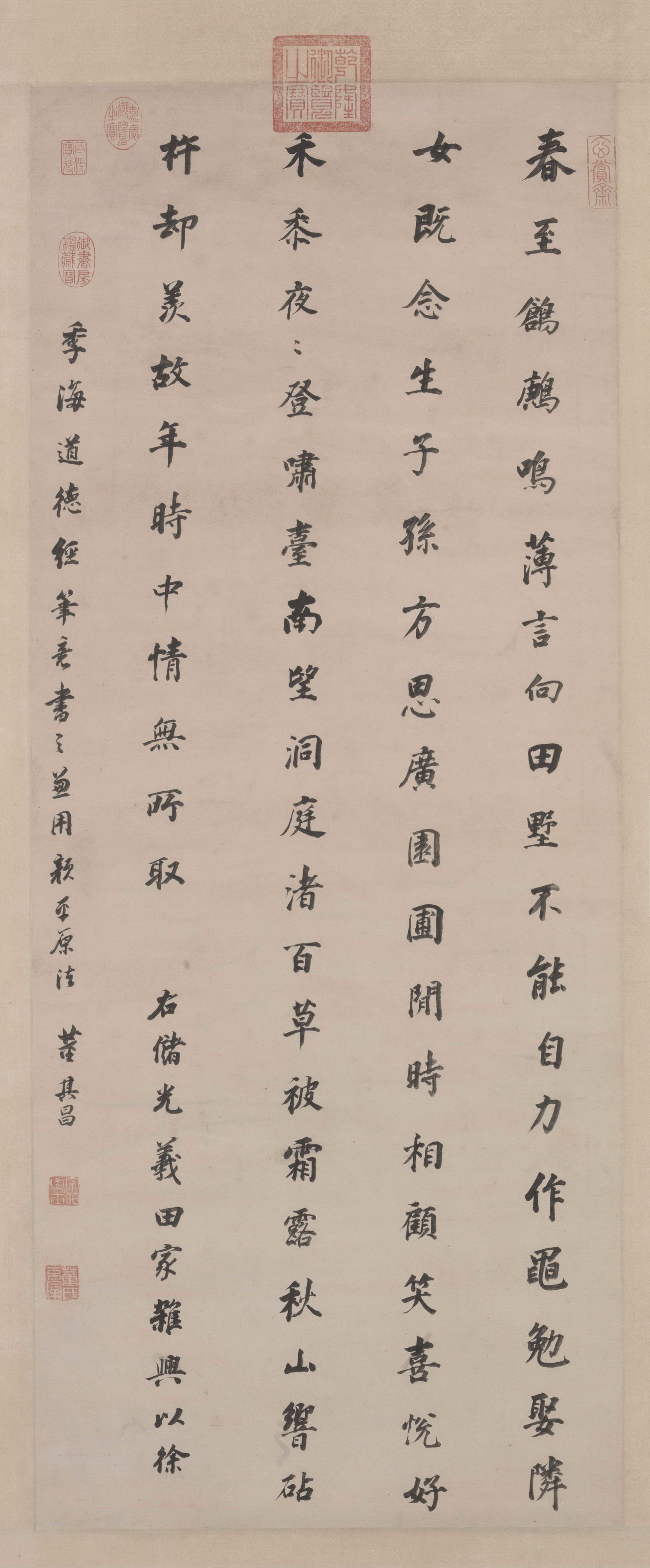 書法欣賞魏晉書法唐朝書法宋朝書法元朝書法明朝書法清朝書法近現代書法字典網>> 歷代書法>> 明朝>> 董其昌·儲光羲《田家雜興》正文 董其昌·儲光羲《田家雜興》作者:董其昌 書體:楷書 【釋文】春至鶬鶊鳴,薄言向田墅。不能自力作,黽勉娶鄰女。既念生子孫,方思廣園圃。閒時相顧笑,喜悅好禾黍。夜夜登嘯台,南望洞庭渚。百草披霜露,秋山響砧杵。卻羨故年時,中情無所取。右儲光羲田家雜興,以徐季海道德經筆意書之,兼用顏平原法。董其昌。《楷書詩》軸,明,董其昌書,紙本,楷書,縱117cm,橫47.8cm。北京故宮博物院藏。書錄的內容是唐代詩人儲光羲《田家雜興》一首,董其昌以其頗為推崇的唐代書法家徐浩、顏真卿的筆法作此楷書,代表了董氏楷書的典型風格。董其昌的相關書法作品:董其昌行草跋《張旭草書古詩四帖卷》 董其昌·題王珣《伯遠帖》 董其昌·儲光羲《田家雜興》 董其昌行書《東方朔答客難並自書詩卷》 董其昌·題宋拓智永《真草千字文》 董其昌《勤政勵學箴》 董其昌行書《三思疏》 董其昌楷書《晁文公語軸》 董其昌行書《龍神感應記》 相關文章:范仲淹《邊事帖》 (行書)【釋文】仲淹再拜,知府刑部仁兄:伏爲起居萬福。施鄉曲之惠,占江山之勝,優哉樂乎。...陸啟成楷書《般若波羅蜜多心經》冊頁 (楷書)陸啟成楷書《般若波羅蜜多心經》冊頁,19頁。陸啟成師從著名書法家蕭勞、李鐸、盧中...歐陽詢行書《仲尼夢奠帖》 (行書)全稱《仲尼夢奠帖》,本帖無款印,紙本 25.5×33.6CM,七十八字,書法筆...張瑞圖《行書鬱郁雙松老詩》 (行書)張瑞圖《行書鬱郁雙松老詩》紙本行書 釋文:鬱郁雙松老,何年雨後移。插竿拈直乾,持...劉致《跋鮮于樞草書韓愈進學解》 (行楷)【釋文】鮮于困學之書始學奧敦周卿竹軒後學姚魯 公雪齋為湖南憲司經歷見李北海嶽麓寺...怎樣臨習《禮器碑》 (不詳)《禮器碑》是東漢隸書成熟時期的代表作,在漢隸巾較為規範,是學習隸書的最佳範本之一...康有為《行書太白閒雲中堂》 (行書)康有為《行書太白閒雲中堂》 紙本行書 130cm×64cm 長沼弘毅藏品釋文...吳昌碩篆書《石鼓文賢如七言聯》 (篆書)吳昌碩《石鼓文賢如七言聯》 133.6×27.9cm×2 紐約蘇富比2016...薛紹彭行草《雜書卷》 (行草)薛紹彭《雜書卷》 行草書,紙本,26.1x303.5 cm 台北故宮博物院藏 此...文徵明小楷《偶適溪樓輒題二十韻帖》 (小楷)明代文徵明楷書尺牘大圖欣賞《偶適溪樓輒題二十韻帖》,尺寸:29x67厘米,台北故...