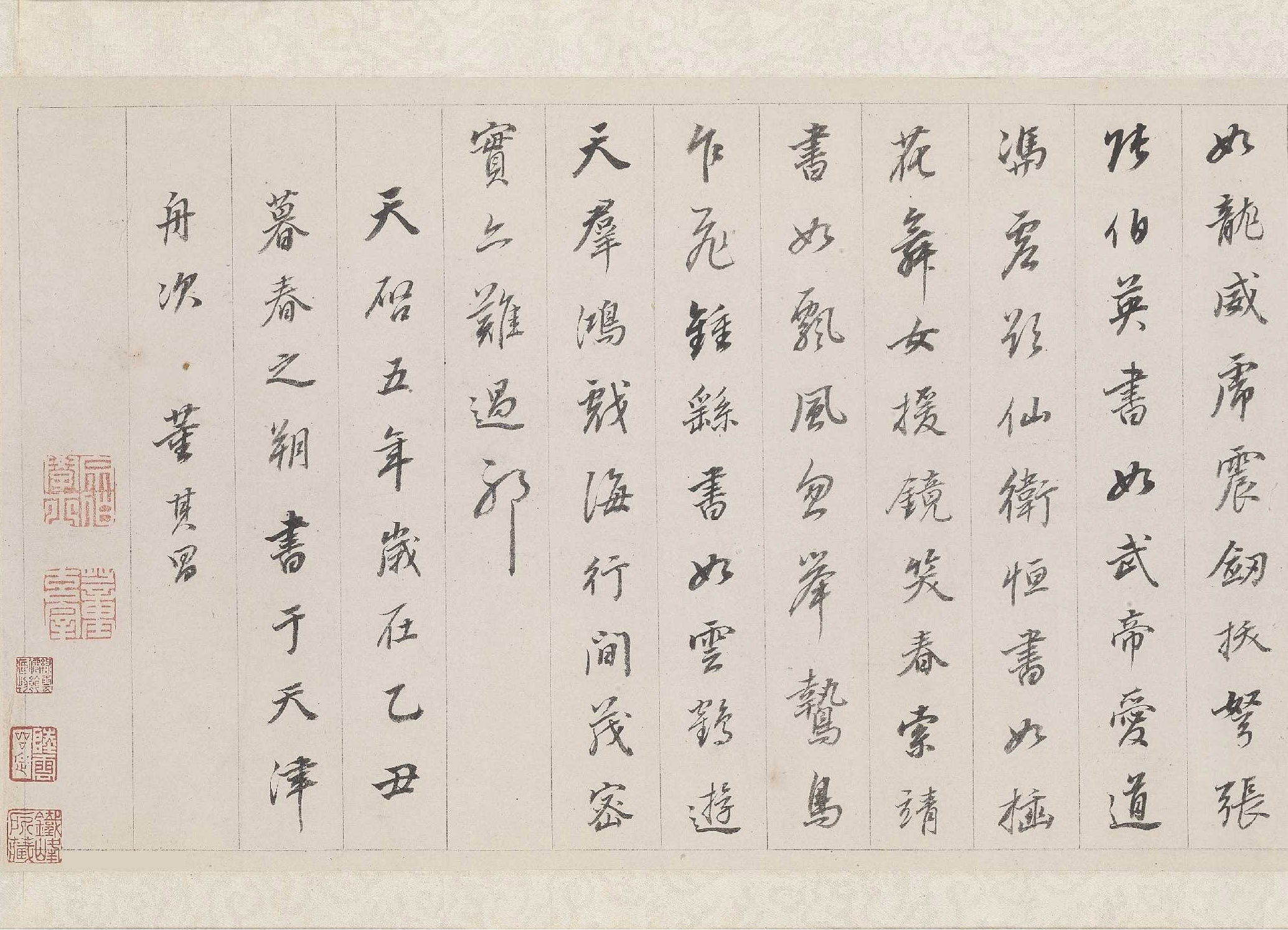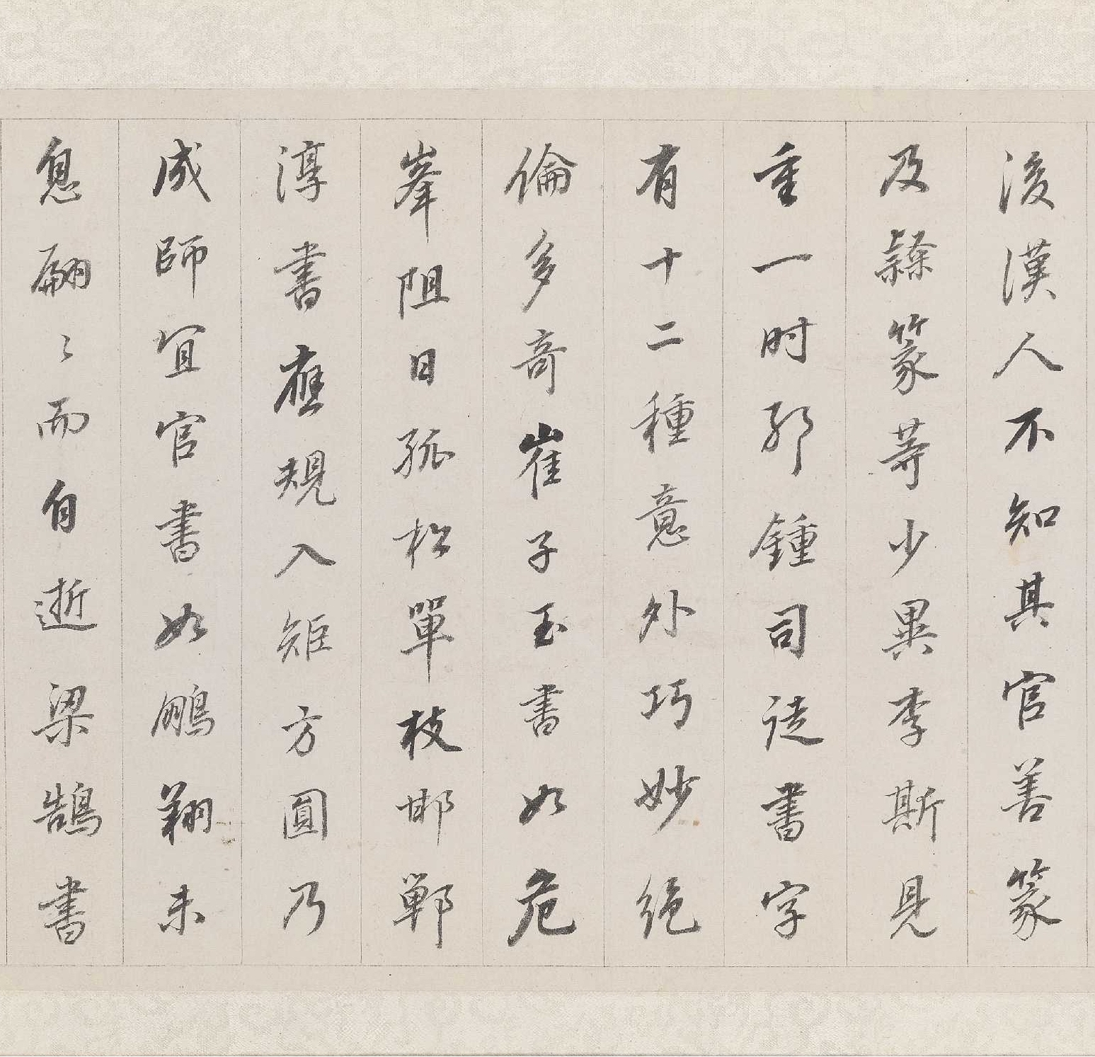 書法欣賞魏晉書法唐朝書法宋朝書法元朝書法明朝書法清朝書法近現代書法字典網>> 歷代書法>> 明朝>> 董其昌·梁武帝書評卷(4)正文 董其昌·梁武帝書評卷(4)作者:董其昌 書體:行書 首 頁 上一頁 1 2 3 4 董其昌的相關書法作品:董其昌·跋米友仁《瀟湘奇觀圖》 董其昌·方暘谷小傳卷 董其昌行草《羅漢贊等書卷》 董其昌行書跋陸機《平復帖》 董其昌·臨冠軍帖 董其昌行書《心經》 董其昌行草《小赤壁詩冊頁》 董其昌·論書並書杜甫詩卷 董其昌·題黃公望《富春山居圖》 相關文章:董其昌行書《龍神感應記》 (行書)董其昌行書欣賞: 葉向高撰《龍神感應記》,葉向高,字進卿,號台山,官任禮部尚書。...《蘭亭序》五個摹本比較《蘭亭序》又名《蘭亭宴集序》、《蘭亭集序》、《臨河序》、《禊序》、《禊貼》。行書...伊秉綬隸書《退一步齋橫幅》 (隸書)隸書“退一步齋” 橫額 47×139cm 紙本 1813年 上海博物館藏...阮元《隸書含和年豐八言聯》 (隸書)阮元《隸書含和年豐八言聯》絹本隸書 113×28.5cm 1843年 山西省博...30多年前啟功等大師為人民日報海外版的題字30多年前歐陽中石頭、林散之、沈鵬、啟功、趙朴初、范曾等書法大師們為八十年代人民...倪瓚楷書《呈寓齋詩帖》 (楷書)倪瓚《呈寓齋詩帖》 1372 香港中文大學藏釋文:中秋夜月明勝常年良夫與景和攜酒...王獻之·新婦地黃湯帖 (行草)【釋文】獻之白:思戀,觸事彌至。獻之既欲過餘杭,州將若比還京,必視之。來月十左右...顏真卿楷書《多寶塔碑》 (楷書)顏真卿《多寶塔碑》,全稱《大唐西京千福寺多寶塔感應碑》,天寶十一年(752)四月...岳飛前《出師表》 (行草)在南陽武侯祠大殿左側的碑廊里,鑲嵌著諸葛亮的前後《出師表》石刻。前後《出師表》共...李陽冰篆書《顏家廟碑額》 (篆書)李陽冰篆書《顏家廟碑額》 ,西安碑林藏。釋文: 顏氏家廟之碑。