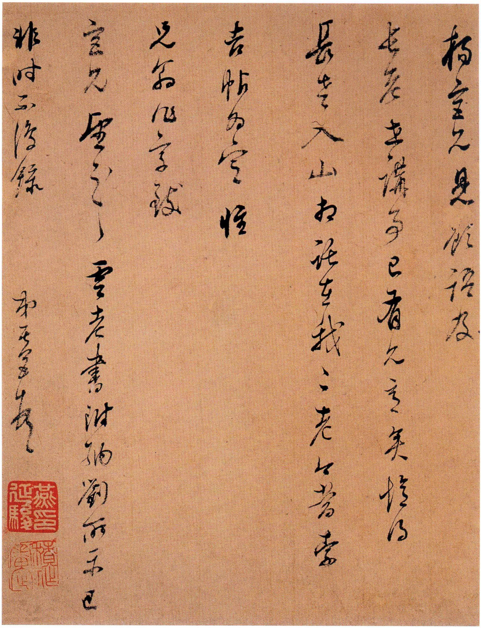書法欣賞魏晉書法唐朝書法宋朝書法元朝書法明朝書法清朝書法近現代書法字典網>> 歷代書法>> 明朝>> 董其昌《草書手札》正文 董其昌《草書手札》作者:董其昌 書體:草書 【釋文】楊宮兄見顧,語及長老世講事,已有兄意矣。憶得長老入山相託在我二老,今當索吉帖為定。惟兄翁作字致宮 兄,望足下、雲老書附納。劉所示已非時,不復錄。弟其昌頓首。董其昌《草書手札》,美國寶蒙堂藏。此帖受者已不可考,帖中所及之長老、楊宮、雲老及劉姓者也雖以確指。董其昌的相關書法作品:董其昌·儲光羲《田家雜興》 董其昌《臨米芾行書長卷》 董其昌行書《為丁雲鵬賀壽詩》 董其昌楷書《儲光義五言詩軸》 董其昌·酒德頌 董其昌·題黃公望《富春山居圖》 董其昌《浚路馬湖記》 董其昌·跋米友仁《瀟湘奇觀圖》 董其昌行書 《蘇軾重九詩軸》 相關文章:高二適行書《贊焦裕祿橫幅》 (行書)高二適《贊焦裕祿橫幅》紙本行書 28.5×104.5cm 1966年 江蘇省美...文徵明《前出師表》小楷 (小楷)文徵明的書畫造詣極為全面,其詩、文、書、畫無一不精。人稱是“四絕”的全才。他雖學...西漢隸書《阜陽漢簡》 (隸書)《阜陽漢簡》為西漢初期簡冊。1977年在阜陽縣雙古堆1號漢墓中發掘出土。墓主夏侯...傅山《草書祝錫予六十壽十二條屏》軸 (草書)傅山《草書祝錫予六十壽十二條屏》軸 綾本 200×51.5cm×12 山西省...米芾·甘露帖 (行書)【釋文】芾頓首再啟。弊居在丹徒行衙之西,翛閒堂、漾月、佳麗亭在其後,臨運河之闊水...傅堯俞·蒸燠帖 (行楷)傅堯俞《蒸燠帖》,紙本,行楷書,縱26.3厘米,橫17.3厘米。《蒸燠帖》是傅堯...徐無聞篆書《戰國臨中山王三器銘文》 (篆書)徐無聞60歲臨戰國中山王三器銘文,辛未(1991年)九月臨。徐無聞(1931—1...張瑞圖《東坡詞水調歌頭赤壁懷古》 (行書)張瑞圖《東坡詞水調歌頭赤壁懷古》,行書,書於自作畫《後赤壁圖》卷後,縱27.9c...張照行草《莫放最難七言聯》 (行草)張照《行草書莫放最難七言聯》紙本行草書 122×30.9cm 瀋陽故宮博物院藏...黃庭堅行書《致雲夫七弟尺牘》 (行書)黃庭堅《致雲夫七弟尺牘》紙本行書 32.6×65.4cm 台北故宮博物院藏(故...