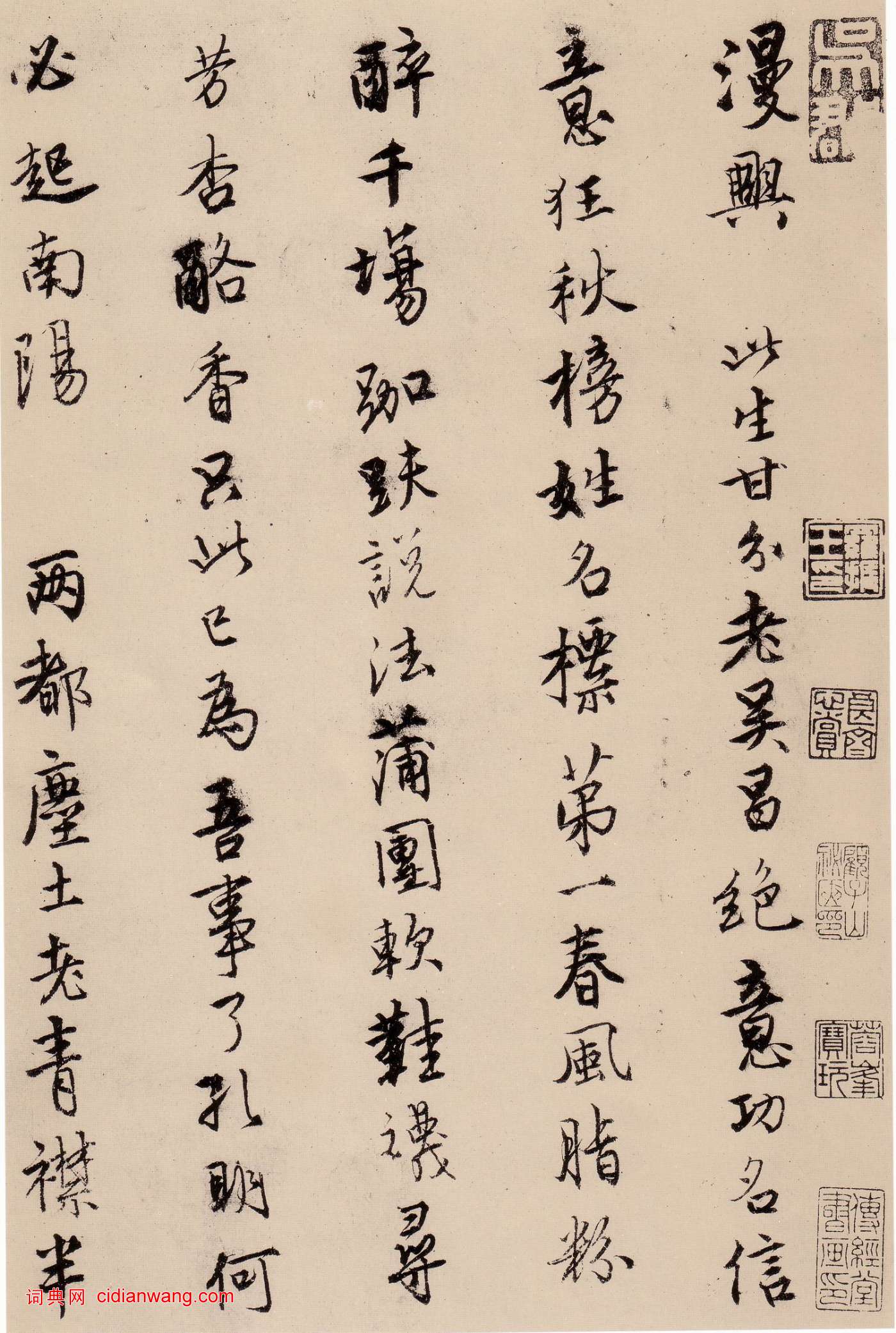 《唐寅漫興墨跡》是其為友人所書的自作漫興詩,通卷千餘字一氣呵成,用筆精到細膩,體勢向右欹側,富有生動姿態,如高雅之士,閒庭信步於閬苑林木之間,十分耐人尋味,卷後末署書寫年月,但從其淡雅自然的筆調之中當為其晚年所書,唐寅傳世真跡甚少,除《落花詩冊》外,《漫興》便是其主要的代表作品。
