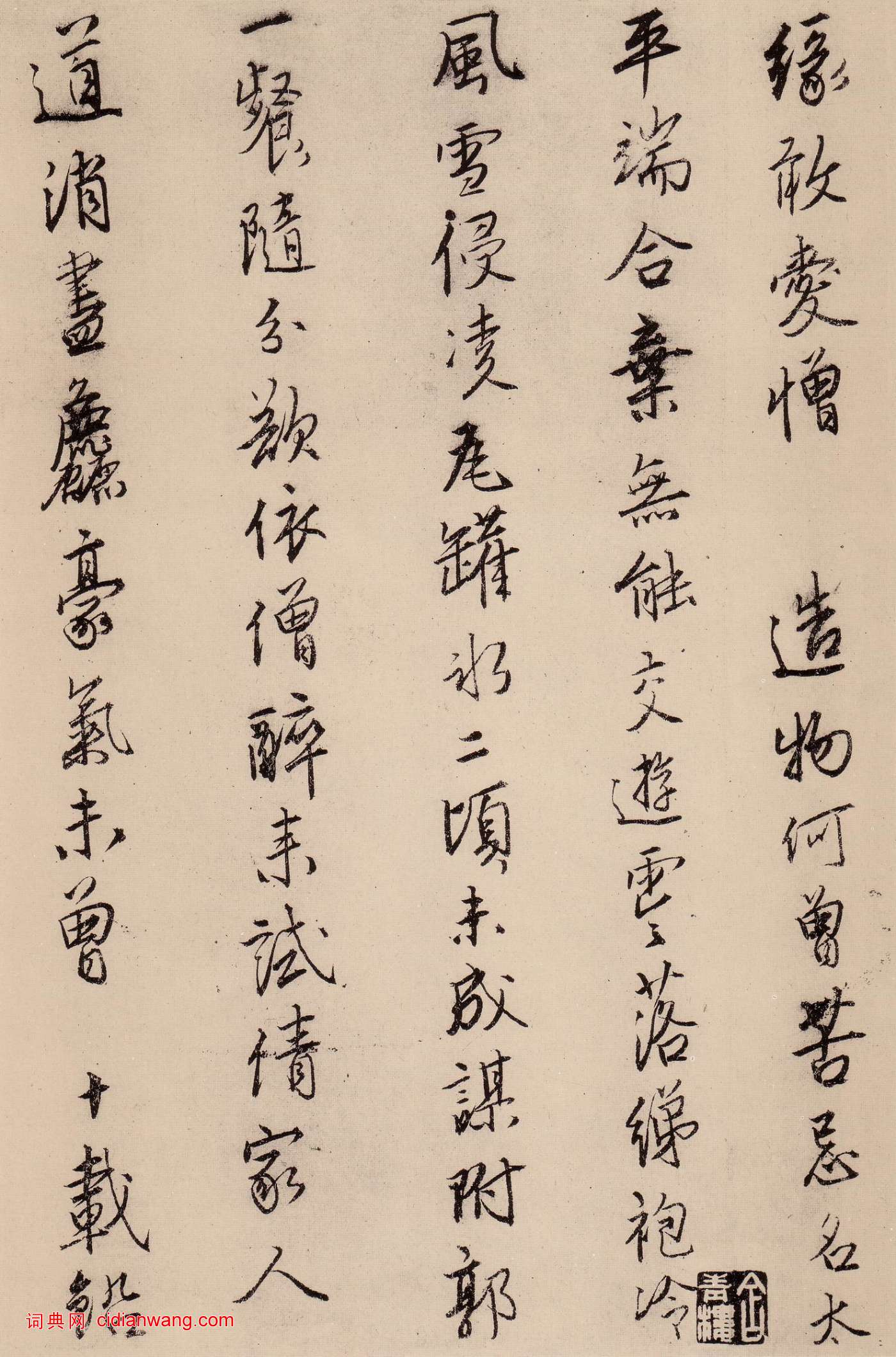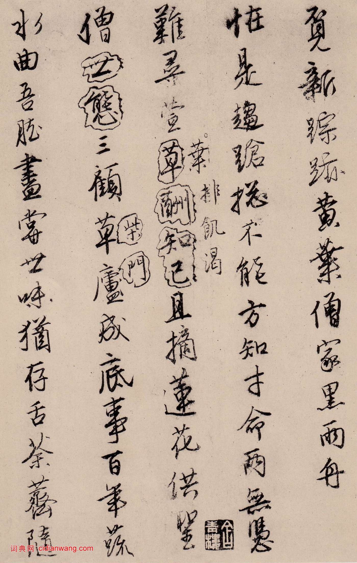 書法欣賞魏晉書法唐朝書法宋朝書法元朝書法明朝書法清朝書法近現代書法字典網>> 歷代書法>> 明朝>> 唐寅 漫興墨跡(4)正文 唐寅 漫興墨跡(4)作者:唐寅 書體:行書 首 頁 上一頁 1 2 3 4 5 6 7 8 9 下一頁 尾 頁 全文2015-12-24 12:40:05 唐寅的相關書法作品:唐寅行書題《立石叢卉圖》 唐寅行書《尺牘之二》 唐寅·自題《李端端圖》 唐寅《落花詩冊》普林斯頓大學附屬美術館藏本 唐寅《吳門避暑詩》 唐寅行書題《事茗圖卷》 唐寅行書《蜀葵圖扇面》 唐寅行書《跋宋王詵江山疊翠圖》 唐寅行書自題《秋菊圖》 相關文章:北齊《沙丘城造像殘碑》 (楷書)《北齊沙丘城造像殘碑》即《北齊河清三年造像記》,簡稱《沙丘碑》正書。此碑1993...新莽篆書《青銅詔版》 (篆書)新莽時期 《青銅詔版》青銅 25.9×25.7cm 上海博物館藏 由上海博物館...黃道周楷書《丙子秋送省試諸友作詩扇》 (楷書)黃道周《丙子秋送省試諸友作詩扇》金箋 楷書 16.5×50.5cm 崇禎九年(...董其昌·題黃公望《富春山居圖》 (行書)董其昌題黃公望《富春山居圖》,行書,台北故宮博物院藏。釋文:大痴畫卷,予所見若檇...曾肇行書尺牘《行復歲暮帖》 (行書)曾肇 尺牘《行復歲暮帖》 紙本 28.7x50.5cm 台北故宮博物院藏釋文:肇...沈尹默:顏真卿《述張旭筆法十二意》釋譯張旭,字伯高。顏真卿,字清臣。《唐書》皆有傳。世人有用他兩人的官爵稱之為張長史、...楊慎·石馬泉詩 (行楷)楊慎《石馬泉詩》,行楷,冷金箋本,縱21.5厘米,橫47.2厘米。北京故宮博物院...張即之《斂襟談老氏詩楷書冊》 (楷書)張即之《斂襟談老氏詩楷書冊》 紙本 縱26.5厘米、橫13.6厘米 舟齋...張弼行草《詩文卷》 (行草)《行草詩文》卷,明,張弼書,紙本,行草書,縱29.5cm,橫589cm。北京故宮...米漢雯《行書七律詩軸》 (行書)米漢雯《行書七律詩軸》絹本行書 216×63.8cm 天津博物館藏 釋文:水晶...