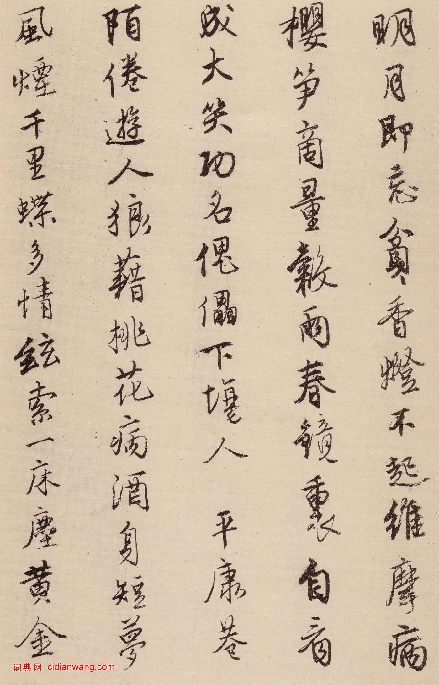 平康巷陌倦遊人。狼藉桃花中酒身。短夢風煙千里蝶。多情弦索一床塵。