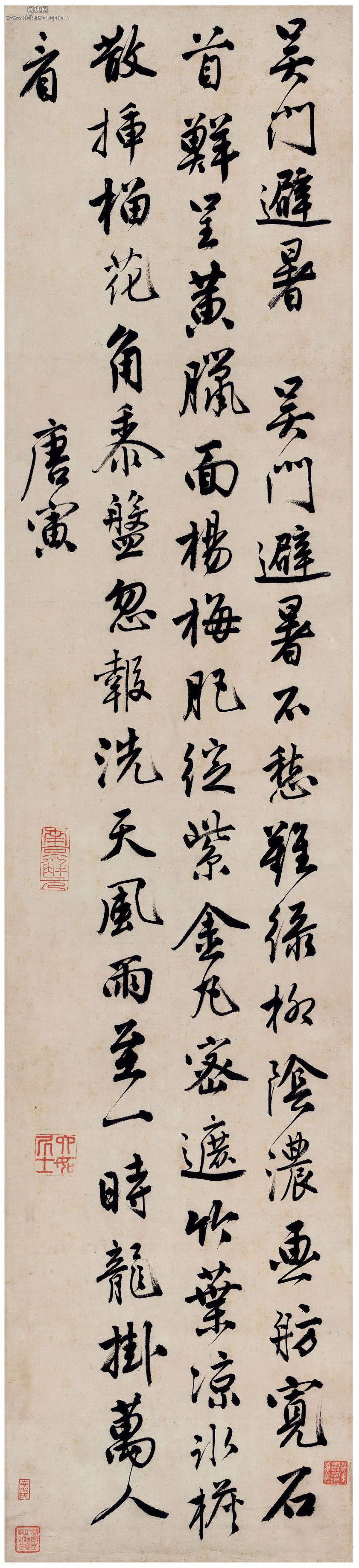 【釋文】吳門避暑不愁難,綠柳蔭濃畫舫寬。石首鮮呈黃蠟面,楊梅肥綻紫金丸。密遮竹葉涼冰檐,散插榴花角黍盤。忽報洗天風雨至,一時龍掛萬人看。唐寅。