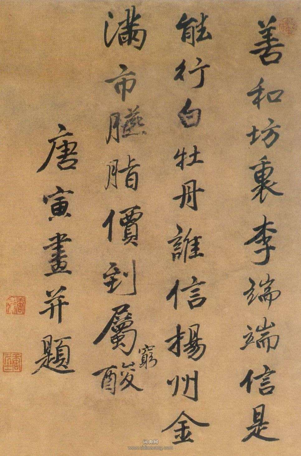 書法欣賞魏晉書法唐朝書法宋朝書法元朝書法明朝書法清朝書法近現代書法字典網>> 歷代書法>> 明朝>> 唐寅·自題《李端端圖》(2)正文 唐寅·自題《李端端圖》(2)作者:唐寅 書體:行書 唐寅《題李端端圖》絹本行書 南京博物院藏釋文:善和坊里李端端,信是能行白牡丹,誰信揚州金滿市,胭脂價到屬窮酸。唐寅畫並題。【資料來源】:南京博物院藏明代吳門繪畫特展《江南風華》首 頁 上一頁 1 2 唐寅的相關書法作品:唐寅《行書七律卷》 唐寅《行書自書詩》 唐寅行書《蜀葵圖扇面》 唐寅行書《書姑蘇寒山寺化鍾疏》 唐寅行書《千金良夜七言律詩軸》 唐寅《行書與若容手書冊》 唐寅《行書贈周良溫詩卷》 唐寅行書《風木圖卷題詩》 唐寅《吳門避暑詩》 相關文章:蔡襄《山堂詩帖》 (行書)【釋文】《丙午三月十二日晚》“欲尋軒檻倒金尊,江上煙雲向晚昏。須倩東風吹散雨,明...蘇軾行書《次韻秦太虛見戲耳聾詩帖》 (行書)蘇軾《次韻秦太虛見戲耳聾詩帖》,行書,台北故宮博物院藏。【釋文】君不見詩人借車無...鄧石如《四體書冊之篆書八闥冊》 (篆書)鄧石如《四體書冊之篆書八闥冊》 無錫博物館藏 釋文:萬綠陰中,小亭避暑,八闥洞開...西漢隸書《江陵鳳凰山木牘》 (隸書)1973年和1975年,先後在湖北江陵紀南城出土的木牘,是西漢文帝時期作品。字型...馮子振·虹月樓記卷 (行書)馮子振《虹月樓記卷》,紙本,33.4×320.8cm。上海博物館藏。《行草虹月...錢杜《行書八言聯》 (行書)錢杜《行書八言聯》紙本行書 128.9×20.3cm×2 上海博物館藏釋 文...徐浩·李峴妻獨孤峻墓誌 (楷書)徐浩所書《李峴妻獨孤峻墓誌》唐天寶十三年刻(754年),李峴撰,在2000年出土...褚遂良《伊闕佛龕碑》宋拓全本 (楷書)《伊闕佛龕碑》亦稱“三龕記”“龍門三龕碑”“伊闕佛龕之碑”,唐貞觀十五年十一月(...趙孟頫草書《種松帖》 (草書)《種松帖》是他寫給老家的書信,信中提及自己顧念家鄉之事,但心有餘而力不足,難以事...張即之行楷《金剛般若波羅蜜經》 (行楷)張即之《金剛般若波羅蜜經》 紙本 行楷 縱32.3厘米 日本京都智積院藏《金剛般...