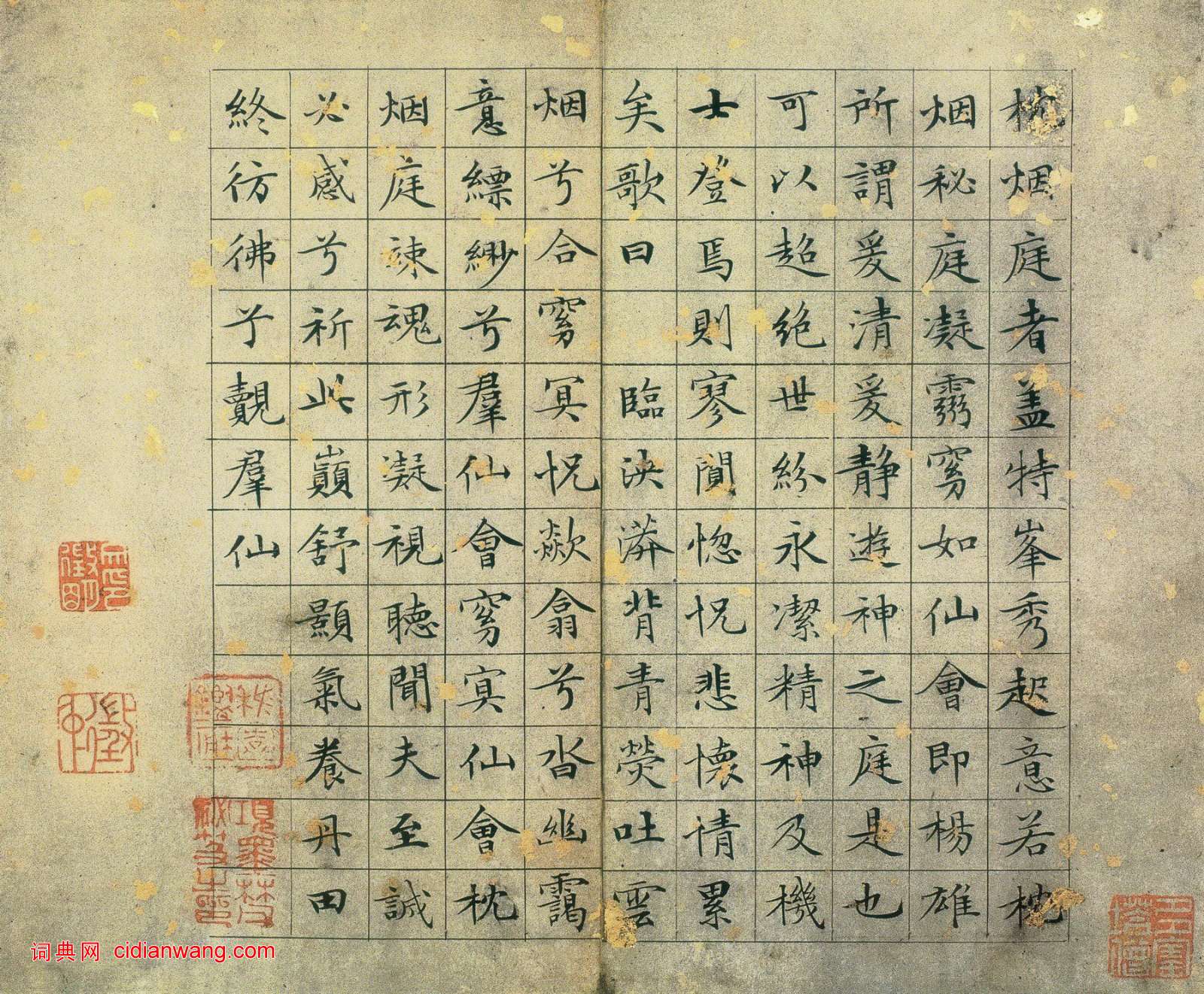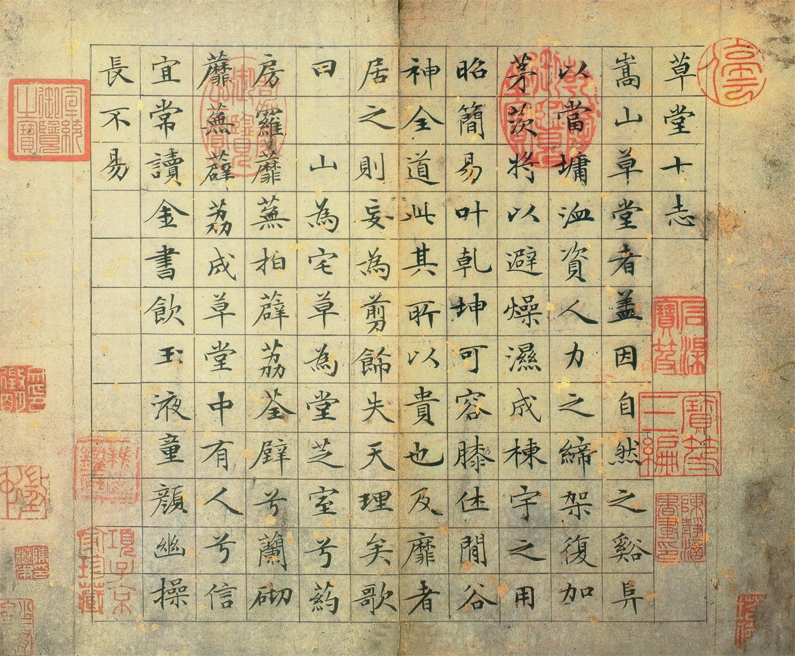 文徵明小楷《草堂十志》,書寫了唐代詩人盧鴻一的《嵩山十志十首》。這件小楷字跡清秀、婀娜多姿,是文徵明傳世之作中的一件精品。此件冊頁縱二十三點二厘米,橫二十八點四厘米,鈐有乾隆、嘉慶、宣統內府鑑藏印,現藏於故宮博物院。
