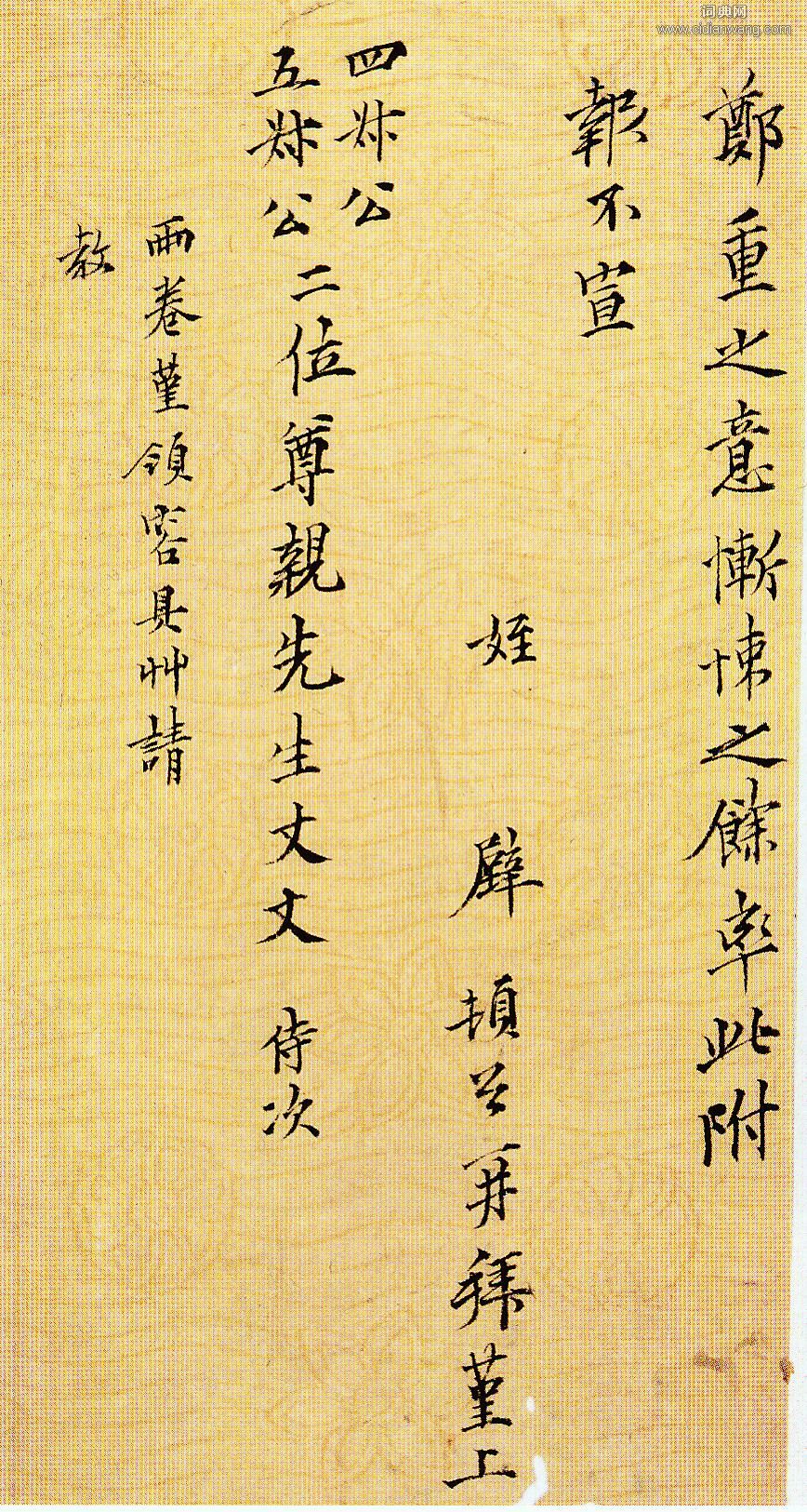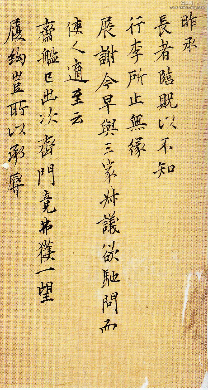 書法欣賞魏晉書法唐朝書法宋朝書法元朝書法明朝書法清朝書法近現代書法字典網>> 歷代書法>> 明朝>> 文徵明《長者帖》正文 文徵明《長者帖》作者:文徵明 書體:楷書 文徵明《長者帖》,尺牘,楷書,故宮博物院藏。文徵明的相關書法作品:文徵明《跋右軍十七帖》 文徵明·跋張即之《汪氏報本庵記》 文徵明《長者帖》 文徵明《前出師表》小楷 文徵明·草堂十志 文徵明《跋祝允明草書赤壁賦冊》 文徵明·行書自作詩卷 文徵明·行書卷 文徵明·跋祝允明草書赤壁賦冊 相關文章:蔡襄·彥猷侍讀帖 (行書)【釋文】襄再拜。遠蒙遣信至都波,奉教約,感戢之至。彥范或聞已過南都,旦夕當見。青...沈周《聲光帖》 (行書)【釋文】向自金仲,寄至蘇合丸,珍佩、珍佩。日來知德與位稱聲光,向隆可見,德門舊族...宋珏·隸書七律詩軸 (隸書)宋珏《隸書七律詩軸》,2000北京中國千年傳世書法珍品展(刊於《中國書法》200...錢大昕《隸書名酒異書七言聯》 (隸書)錢大昕《隸書名酒異書七言聯》 122×30cm×2 嘉定博物館藏釋文:名酒過...大雅集王羲之《興福寺半截碑》 (行書)唐代僧大雅等集晉王羲之行書碑刻。開元九(七二一)年立於長安。此碑又名《吳文碑》徐...龔賢《行書經故里詩扇》 (行書)龔賢《行書“經故里”詩扇》 上海博物館藏 釋文:歸來非遠客,下馬淚雙垂。故里宛...張雨《獨游龍井方圓庵行書詩卷》 (行書)張雨《獨游龍井方圓庵行書詩卷》行書 30.5cm×77.5cm 至正二年(13...柳公權楷書《陸士衡演連珠》 (楷書)柳公權楷書《陸士衡演連珠》拓片,相傳《陸士衡演連珠》只比玄秘塔早寫了六個月。此時...吳玉如小楷《臨樂毅論》 (小楷)吳玉如《臨樂毅論》小楷 1931年作 釋文:略 款識:辛未前三日臨。 鈐印:吳家...褚遂良《小字陰符經》 (小楷)《小字陰符經》,刻本,褚遂良書。褚遂良曾三次書寫《陰符經》。貞觀六年(公元632...
