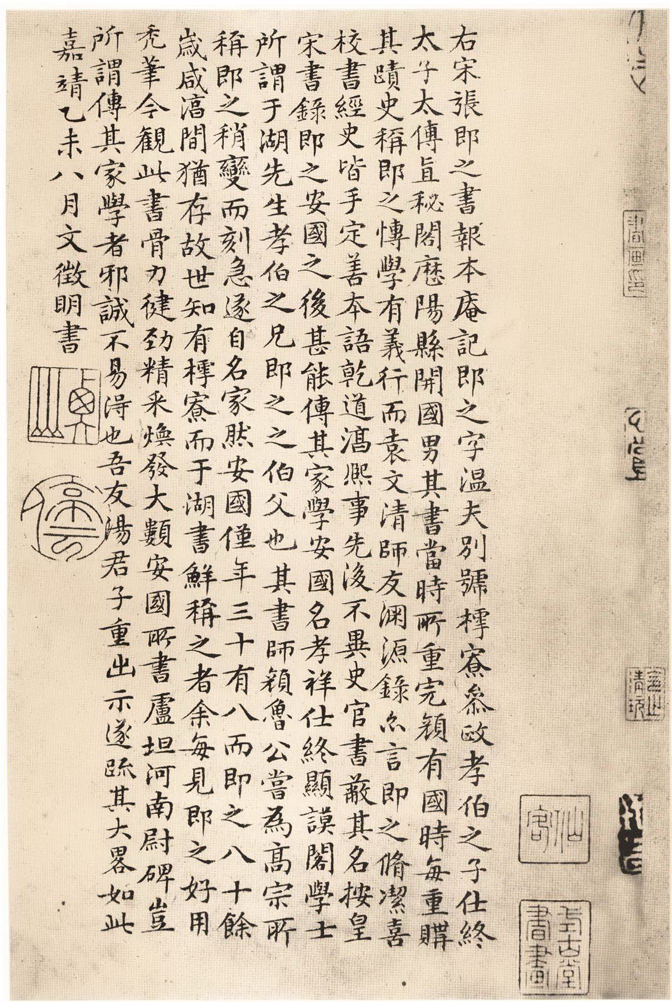 書法欣賞魏晉書法唐朝書法宋朝書法元朝書法明朝書法清朝書法近現代書法字典網>> 歷代書法>> 明朝>> 文徵明·跋張即之《汪氏報本庵記》正文 文徵明·跋張即之《汪氏報本庵記》作者:文徵明 書體:楷書 文徵明跋張即之《汪氏報本庵記》,楷書。遼寧省博物館藏。張即之《汪氏報本庵記》,紙本,行楷,縱29.3厘米,橫91.4厘米。小字行書38行,凡688字。文徵明的相關書法作品:文徵明《跋右軍十七帖》 文徵明《拙政園圖冊》 文徵明《登君山》 文徵明·跋祝允明草書赤壁賦冊 文徵明·行書自作詩卷 文徵明《歸去來兮辭》 文徵明《前出師表》小楷 文徵明《長者帖》 文徵明《跋祝允明草書赤壁賦冊》 相關文章:乾隆臨王羲之《蘭亭序》 (行書)在中國歷史上的眾多君王中,很少有像乾隆皇帝那樣對書法藝術達到一種幾近痴迷的程度。...胡林翼《行書四屏》 (行書)胡林翼《行書四屏》 湖南省博物館 藏釋文:窗影搖群動,牆陰載一峰。野壚風自爇,山...劉墉《行書四言聯》 (行書)劉墉《行書四言聯》紙本行書 55.2×16.8cm×2 台北故宮博物院藏釋文...楊慎·石馬泉詩 (行楷)楊慎《石馬泉詩》,行楷,冷金箋本,縱21.5厘米,橫47.2厘米。北京故宮博物院...黃賓虹《篆書太史老農七言聯》 (篆書)黃賓虹《篆書太史老農七言聯》 選自《高山仰止·紀念黃賓虹誕辰150周年系列展...董其昌·跋米友仁《瀟湘奇觀圖》 (行書)董其昌跋米友仁《瀟湘奇觀圖》,行書,縱19.8cm,故宮博物館藏。題跋前後共分三...唐寅《行書與若容手書冊》 (行書)唐寅《行書與若容手書冊》紙本行書 27.3×64.1cm 美國大都會藝術博物館...王知敬·李靖碑 (楷書)元拓衛景武公李靖碑《李靖碑》,全稱《大唐故尚書右僕射特進開府...姜立綱·楷書東銘冊 (楷書)姜立綱楷書《東銘》冊,明,姜立綱書,紙本,縱28.7cm,橫14.8cm。北京故...陳洪綬《行書七絕詩》扇面 (行書)陳洪綬《行書七絕詩》扇面 金箋 約順治六年(約1649)武漢文物商店藏釋文:享盡...