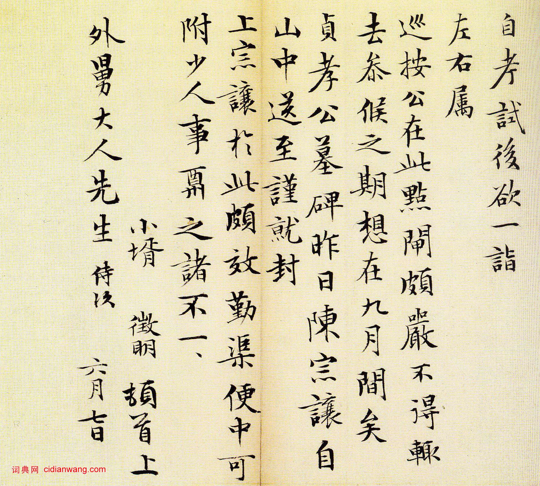 書法欣賞魏晉書法唐朝書法宋朝書法元朝書法明朝書法清朝書法近現代書法字典網>> 歷代書法>> 明朝>> 文徵明《點閘帖》正文 文徵明《點閘帖》作者:文徵明 書體:楷書 文徵明《點閘帖》,楷書尺牘,故宮博物院藏。釋文:自考試後欲一詣,左右屬、巡按公在此點閘頗嚴,不得輒去。恭候之期,想在九月間矣。貞孝公墓碑昨日陳宗讓自山中送至,謹就對。上宗讓於此,頗效勤渠,便中可附少人事,酬之諸不一。——小壻征明頓首上 外舅大人先生侍次 六月日2015-4-7 12:46:06 文徵明的相關書法作品:文徵明大字行書《題宋高宗賜岳飛手敕》 文徵明《行書致陸師道二札》之一 文徵明《行書五言詩軸》 文徵明行書 《剡藤湘竹七言詩軸》 文徵明《草書七絕詩軸》 文徵明小楷《摩訶般若波羅蜜多心經》 文徵明行書《觀李成之寒林平野圖後長歌》卷 罕見!文徵明手稿墨跡 文徵明《草書七律立軸》 相關文章:任希夷跋司馬光《資治通鑑殘稿》 (楷書)任希夷跋司馬光《資治通鑑殘稿》,楷書,縱33.8厘米。中國國家圖書館藏。釋文:溫...魯迅《行書偈語》 (行書)魯迅《行書偈語》紙本行書 24×20cm 匡時2015秋拍 釋文:放下屠刀,立...王鐸行書《燕磯書事軸》 (行書)王鐸行書《燕磯書事軸》, 縱224厘米、橫50厘米,綾本,1643年書 廣東省博...北魏《石夫人墓誌》 (楷書)魏尚書江陽王次妃石(婉)夫人墓志銘(永平元年十一月二十三日)石婉墓誌,全稱《江陽...傅山草書《杜甫遣興之一詩扇》 (草書)傅山《草書杜甫遣興之一詩扇》金箋草書 16×52.1cm 北京故宮博物院藏釋文...全國第一屆書法篆刻展覽-篆書部分1980年5月,全國第一屆書法篆刻展覽(國展)在瀋陽展出,現與大家分享由人民美術...翁方綱·行書立軸 (行書)【釋文】蘭亭臨本,蘇太簡家藏者與張金界奴三米諸本合於潁井絹本,此即神龍本也。豐道...陽陵虎符 (篆書)陽陵虎符實物 秦代 中國國家博物館藏虎符高三.一四厘米,長八.九厘米,相傳山東省...沈荃行書《臨褚遂良枯樹賦軸》 (行書)沈荃《臨褚遂良枯樹賦軸》紙本行書 116×42cm 河北省博物館藏 釋文:落實...趙孟頫行書《酒德頌》 (行書)《酒德頌》紙本,行書,縱28.5cm,橫65.2cm,19行。 北京故宮博物院藏...