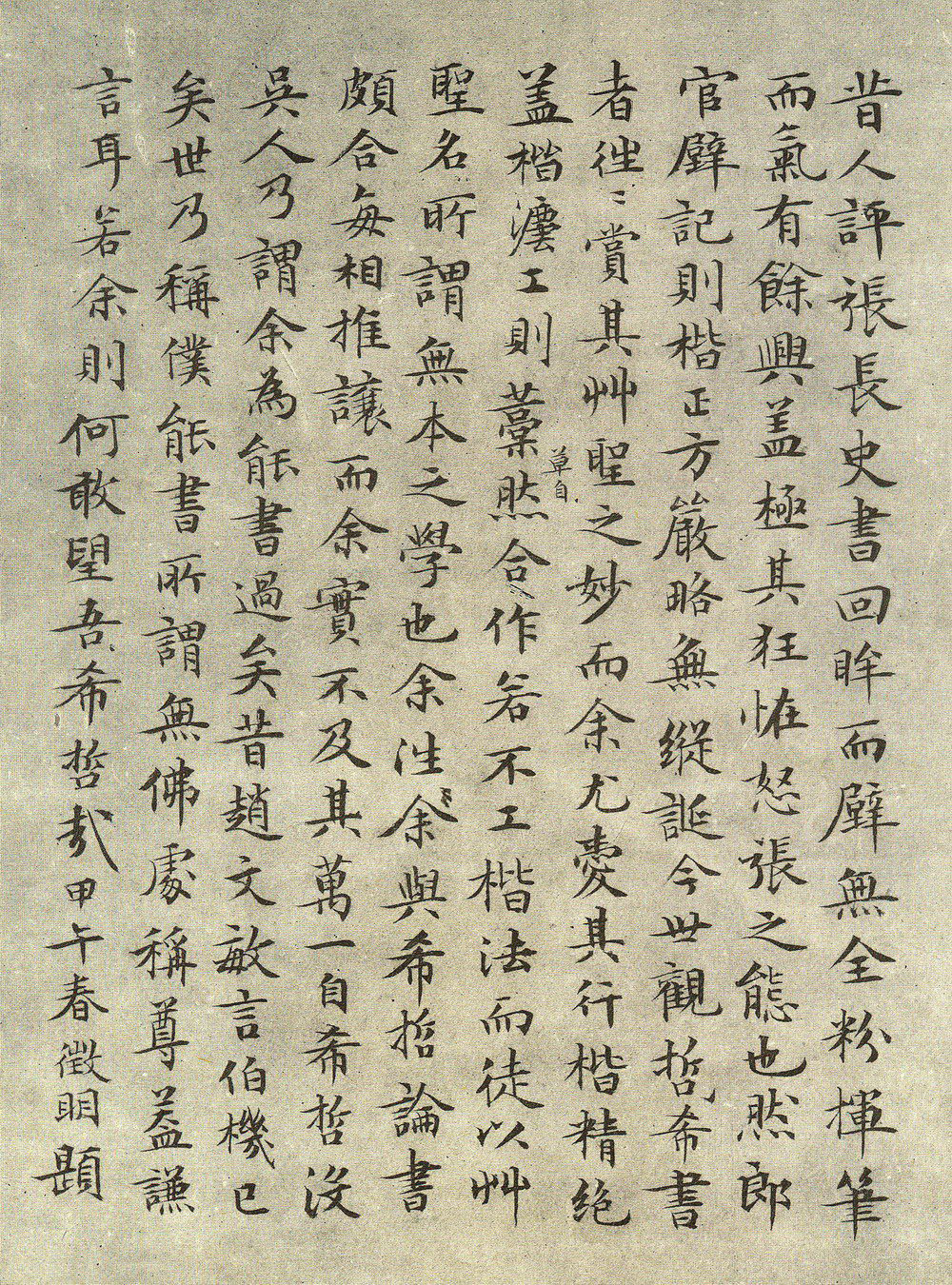 昔人評張長史書,回眸而壁無全粉,揮筆而氣有餘興。蓋極其狂怪怒張之態也。然郎官壁記則楷正方嚴略無縱誕。今世觀希哲書往往賞其草聖之妙,而余尤愛其行楷精絕。蓋楷法既工,則藁草自然合作。若不工楷法,而徒以草聖名世,所謂無本之學也。余往與希哲論書頗合,每相推讓。而余實不及其萬一也。自希哲亡,吳人乃以余為能書,過矣。昔趙文敏題鮮于太常臨鵝群帖,所謂無佛處稱尊者蓋謙言也。若余則何敢望吾希哲哉。甲午春徵明題