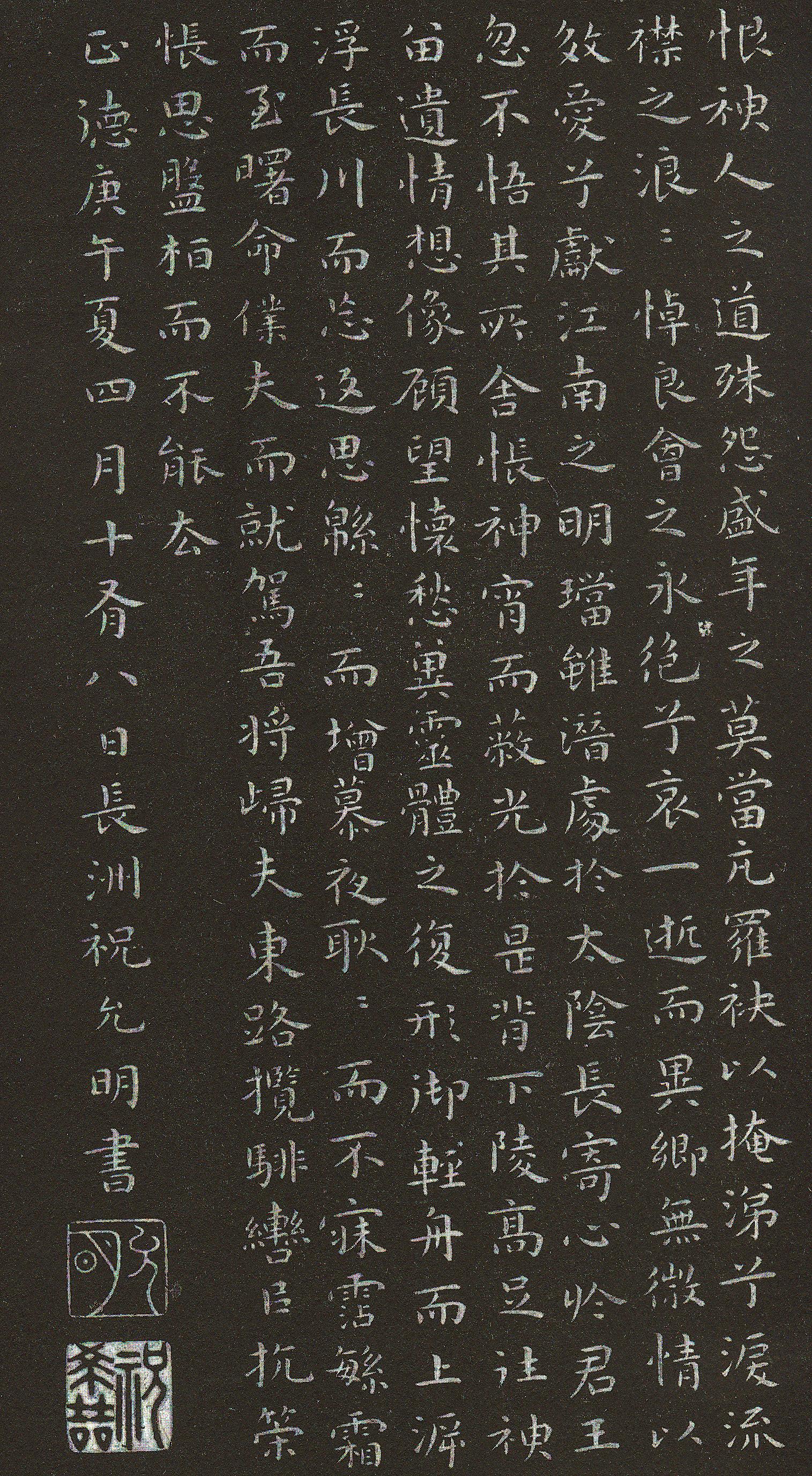資源下載魏晉書法唐朝書法宋朝書法元朝書法明朝書法清朝書法近現代書法字典網>> 歷代書法>> 明朝>> 祝允明·小楷洛神賦(2)正文 祝允明·小楷洛神賦(2)作者:祝允明 書體:小楷 首 頁 上一頁 1 2祝允明的相關書法作品:祝允明小楷 《和陶飲酒詩廿首》冊 祝允明·劉君文威聽泉記 祝允明《七律壽礪庵詩》 祝允明臨懷素《秋興八首》 祝允明小楷《和陶飲酒詩》 祝允明楷書《祖允暉慶誕記》 祝允明行草·歸田賦 祝允明楷書《燕喜亭等四記》 祝允明《樂志論草書軸》 相關文章:文徵明行草《胡笳十八拍》 (行草)文徵明行草作品欣賞《胡笳十八拍》,《胡笳十八拍》是唐代劉商創作的一首古琴曲法,文...楊峴《行書鐵味詩道六言聯》 (行書)楊峴《行書鐵味詩道六言聯》紙本行書 108.6×23.3cm×2 浙江省博物...褚遂良《大字陰符經》 (楷書)《大字陰符經》風格略近《雁塔聖教序》,筆勢縱橫清晰,天趣自然。其總體結構方中見扁...米芾《米南宮十七帖》 (草書)米南宮十七帖為宋米芾《王羲之十七帖》臨摹本,真草對照,甚得原作精髓。原帖是傳世著...康里巎巎草書《李白古風詩卷》 (草書)草書詩書卷之《李白古風詩卷》 紙本 35.0×63.8cm 點擊瀏覽大圖 ...董其昌·儲光羲《田家雜興》 (楷書)【釋文】春至鶬鶊鳴,薄言向田墅。不能自力作,黽勉娶鄰女。既念生子孫,方思廣園圃。...包世臣行草《錄內史與謝尚書書軸》 (行草)包世臣《行草書錄內史與謝尚書書軸》紙本行草書 132×55.5cm 山西省博物...三國吳《谷朗碑》 (隸書)三國·吳《谷朗碑》全稱《吳九真太守谷朗碑》。隸書,三國·吳鳳凰元年(272)...李世民草書《屏風帖》 (草書)李世民草書《屏風帖》,宋嘉泰四年(1204)王允初刻於餘杭,元延祐三年(1316...吳雯《行書七絕詩軸》 (行書)吳雯《行書七絕詩軸》紙本行書 133.3cm×40.9 蘇州博物館藏 釋文:東...