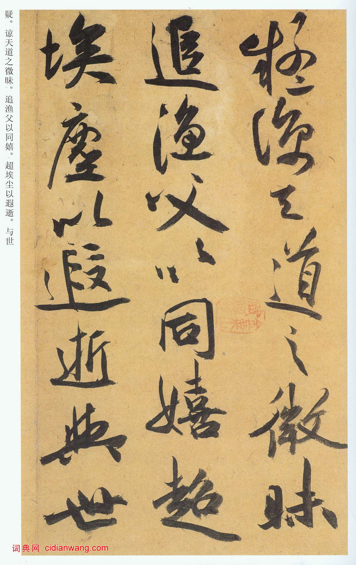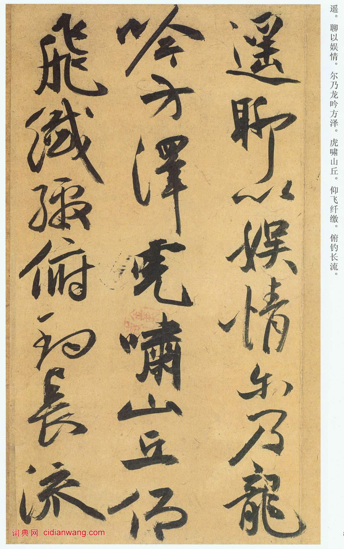 游都邑以永久,無明略以佐時。徒臨川以羨魚,俟河清乎未期。感蔡子之慷慨,從唐生以決疑。諒天道之微昧,追漁父以同嬉。超埃塵以遐逝,與世事乎長辭。於是仲春令月,時和氣清;原隰郁茂,百草滋榮。王雎鼓翼,倉庚哀鳴;交頸頡頏,關關嚶嚶。於焉逍遙,聊以娛情。爾乃龍吟方澤,虎嘯山丘。仰飛纖繳,俯釣長流。觸矢而斃,貪餌吞鉤。落雲間之逸禽,懸淵沉之鯊(魚留,音留)。於時曜靈俄景,繼以望舒。極般游之至樂,雖日夕而忘劬。感老氏之遺誡,將回駕乎蓬廬。彈五弦之妙指,詠周、孔之圖書。揮翰墨以奮藻,陳三皇之軌模。苟縱心於物外,安知榮辱之所如。