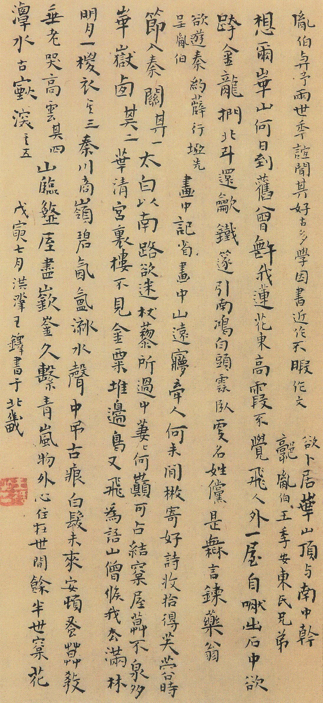 書法欣賞魏晉書法唐朝書法宋朝書法元朝書法明朝書法清朝書法近現代書法字典網>> 歷代書法>> 明朝>> 王鐸《跋西嶽華山廟碑》正文 王鐸《跋西嶽華山廟碑》作者:王鐸 書體:小楷 王鐸《跋西嶽華山廟碑》,小楷。王鐸明末清初貳臣、書畫家。字覺斯,一字覺之。號十樵,號嵩樵, 孟津(今河南孟津)人。天啟二年(1622年)中進士,入翰林院庶吉士,累擢禮部尚書。崇禎十六年(1643年),王鐸為東閣大學士。1644年清朝入關後被授予禮部尚書、官弘文院學士,加太子少保,於永曆六年(1652年)病逝故里。王鐸的相關書法作品:王鐸《草書唐人詩九首》 王鐸行書《寄金陵天目老衲詩》 王鐸·跋米芾《行書三札卷》 王鐸論書法 王鐸的書法筆記 王鐸草書《臨王獻之省前書帖軸》 王鐸行草《臨閣帖》卷 王鐸草書《題野鶴陸舫齋》 王鐸《行草詩稿墨跡十二頁》 “南董北王”王鐸書法 相關文章:斷臂人張文佑書法欣賞 (行書)張文佑,字德輔,號月台經生。1970年生,河南襄城人,中國書法家協會會員。張文佑...鄭簠隸書《王績望野詩軸》 (隸書)王績望野詩軸 紙本 隸書 縱108.5 橫74.3厘米 青島市博物館藏。資料來...蔡襄行楷《虹縣帖》 (行楷)蔡襄書法欣賞行楷書尺牘《虹縣帖》1051年 紙本 31.3 x 42.3cm 台...漢隸珍品《漢故雁門太守鮮于璜碑》 (隸書)漢隸珍品《漢故雁門太守鮮于璜碑》,亦稱《鮮于璜碑》,延熹八年(165)十一月立。...董小宛楷書《 杜甫詩三首扇面》 (楷書)董小宛《 杜甫詩三首扇面》紙本楷書 17×50cm 南京海2016年春拍 款識...錢灃《行書摘錄陶淵明家書句軸》 (行書)錢灃《行書摘錄陶淵明家書句軸》 紙本行書 173.7×80.7cm 上海博物館...周伯琦·楷書朱德潤墓志銘 (楷書)《周伯琦楷書朱德潤墓志銘》簡介:本篇是周伯琦為友人朱德潤撰寫的墓志銘。朱德潤(1...錢良佑跋梁楷《右軍書扇圖》 (行書)錢良佑跋梁楷《右軍書扇圖》 北京故宮博物院藏傅山《草書賀楓仲得孫》 (草書)傅山 《草書賀楓仲得孫》卷 絹本 41.5cm×79.5cm 山西省博物院...唐寅行書《飲中八仙歌》 (行書)唐寅《自書詩》《飲中八仙歌》,風流瀟灑!釋文: 知章騎馬似乘船,眼花落井水底眠。...