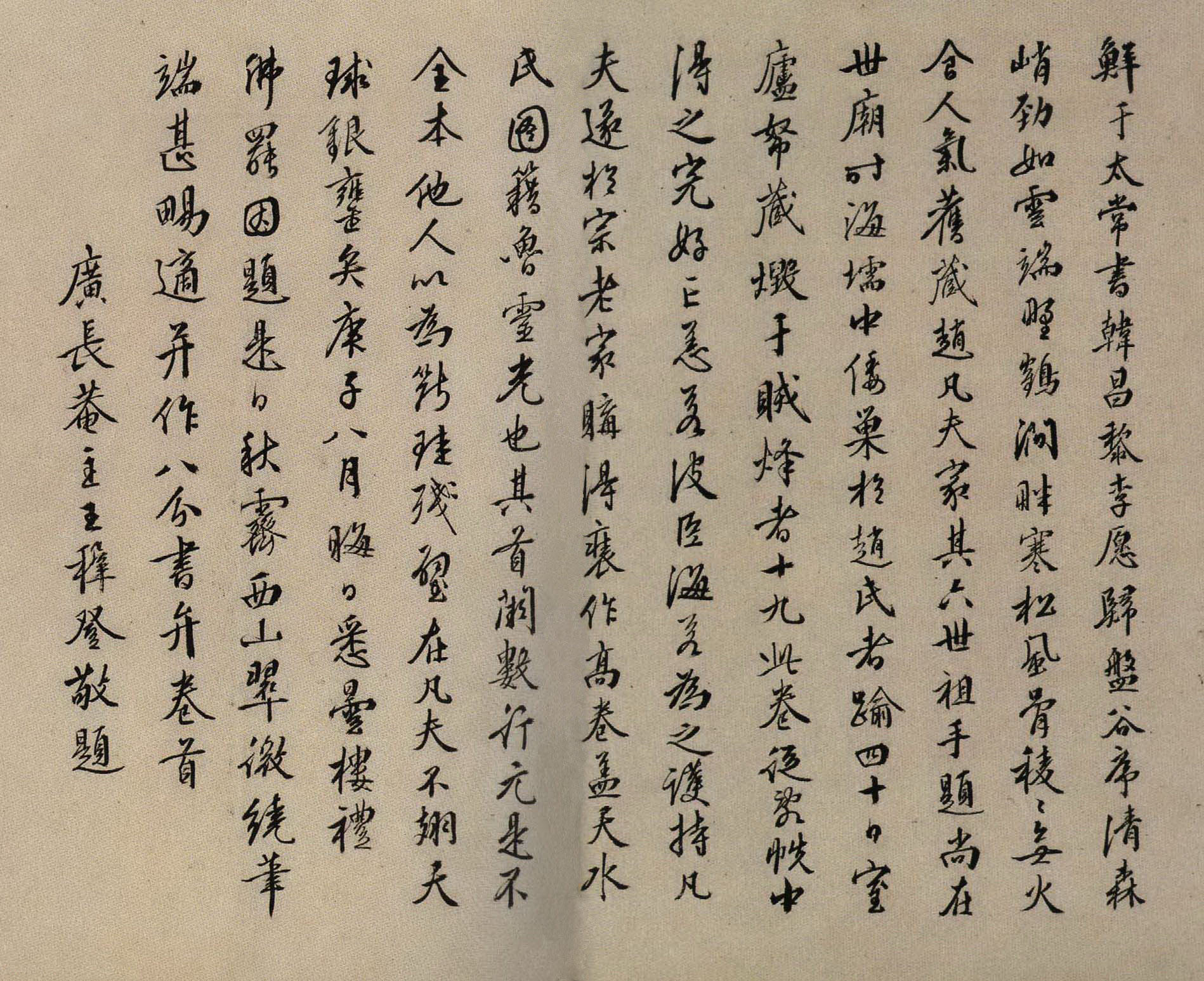 書法欣賞魏晉書法唐朝書法宋朝書法元朝書法明朝書法清朝書法近現代書法字典網>> 歷代書法>> 明朝>> 王穉登·跋鮮于樞《韓愈送李願歸盤谷序卷》正文 王穉登·跋鮮于樞《韓愈送李願歸盤谷序卷》作者:王穉登 書體:行書 王穉登跋鮮于樞《韓愈送李願歸盤谷序卷》,行書,上海博物館藏。王穉登的相關書法作品:王穉登·義興雜詩冊 王穉登·跋趙孟頫《心經行書冊》 王穉登行書《錄宋人語》 王穉登·跋蘇軾《治平帖》 王穉登·題周天球《桃花書屋書法卷》 王穉登·跋鮮于樞《韓愈送李願歸盤谷序卷》 相關文章:高二適行草《致章士釗蘭亭論辯手稿》 (行草)高二適《致章士釗“蘭亭論辯”手稿》 1965 28cmX134cm 高二適紀念...左宗棠行書《滄海青天七言聯》 (行書)左宗棠《行書“滄海青天”七言聯》 湖南省博物館藏釋文:滄海六鰲瞻氣象,青天一鶚見...黃庭堅行書《李公麟五馬圖題記跋語》 (行書)黃庭堅《李公麟"五馬圖"題記跋語》(珂羅版)北京故宮博物院藏宋代傳世名作《五馬圖...黃庭堅草書《花氣薰人帖》 (草書)黃庭堅《花氣薰人帖》 紙本草書 30.7×43.2cm,台北故宮博物院藏釋文:...暑熱與書法的因緣《月令七十二候集解》中說:“暑,熱也,就熱之中分為大小,月初為小,月中為大,今則...祁寯藻行楷《忠厚和平七言聯》 (行楷)祁寯藻《行楷忠厚和平七言聯》箋本行楷書 135×30cm×2 淮安市博物館藏...黃道周《草書自作五言詩軸》 (草書)黃道周《草書自作五言詩軸》 綾本草書 138.5×48.9cm 南通博物苑藏釋...沈曾植《行草書孟浩然夜泊牛渚詩軸》 (行草)沈曾植《行草書孟浩然夜泊牛渚詩軸》紙本行草書 147×40cm 嘉興博物館藏 ...西漢篆書《群臣上壽刻石》 (篆書)漢文帝後元六年(公元前158年)刻。原石為清道光年間楊兆璜在當時的直隸廣平府永年...董其昌·草書張籍七言詩 (草書)【釋文】水北原南野草新,雪消風暖不生塵。城中車馬知無數,能解閒行有幾人。其昌。董...