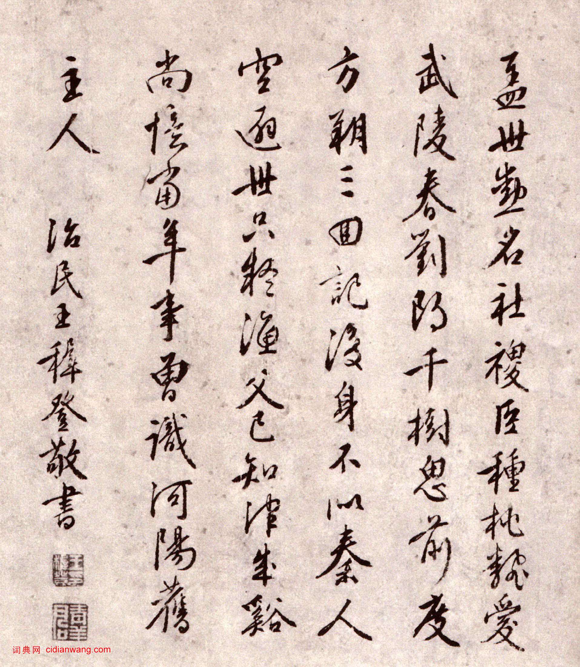 書法欣賞魏晉書法唐朝書法宋朝書法元朝書法明朝書法清朝書法近現代書法字典網>> 歷代書法>> 明朝>> 王穉登·題周天球《桃花書屋書法卷》正文 王穉登·題周天球《桃花書屋書法卷》作者:王穉登 書體:行書 明-王穉登題周天球《桃花書屋書法卷》,行書。2015-7-9 12:44:27 王穉登的相關書法作品:王穉登《行書丁亥初度條幅》 王穉登·題周天球《桃花書屋書法卷》 王穉登·跋鮮于樞《韓愈送李願歸盤谷序卷》 王穉登·跋蘇軾《治平帖》 王穉登·義興雜詩冊 王穉登·跋趙孟頫《心經行書冊》 王穉登《行書軸》 王穉登《行書軸》 王穉登行書《錄宋人語》 相關文章:譚延闓《草書臨十七帖四條屏》 (草書)譚延闓《草書臨十七帖四條屏》紙本草書 173×41.8cm×4 台北故宮博物...鐵保《行書評東坡錄語軸》 (行書)鐵保《行書評東坡錄語軸》,紙本行書,118×28cm。常州博物館藏釋文:東坡先...袁克文小楷跋趙孟頫行書《心經》 (小楷)袁克文跋趙孟頫行書《般若波羅蜜多心經》,趙孟頫為日林和上書心經,小楷題跋釋文:松...聶大年行書《煩求帖》 (行書)聶大年《煩求帖》紙本 行書 22.6×33.8cm 北京故宮博物院藏【釋文】煩...米芾《留簡帖》 (行書)【釋文】芾頓首再拜。前留簡而去,不得一見,於今怏怏。辱教知行李已及。偶以林憲巡歷...王鐸《草書錄語》軸 (草書)王鐸《草書錄語》軸,綾本,縱254.2cm,橫48.2cm,書於崇禎十三年(庚辰...北魏楷書《崔敬邕墓誌》 (楷書)《崔敬邕墓誌》(費念慈舊藏本) 全稱《魏故持節龍驤將軍督營州諸軍事營州刺史征虜將...楊法《隸書軸》 (隸書)楊法《隸書軸》 104×39cm 來源不詳于右任《行書謝眺元中八言聯》 (行書)于右任《行書謝眺元中八言聯》紙本行書 199×44cm×2 重慶博物館藏釋...蔡襄·致彥猷尺牘 (行書)【釋文】襄啟:大研盈尺,風韻異常,齋中之華,繇是而至。花盆亦佳品,感荷厚意。以珪...