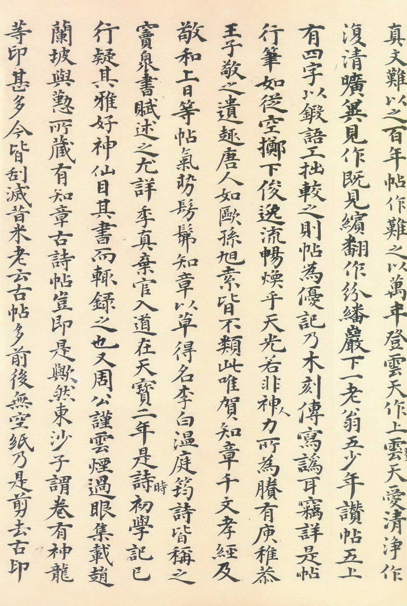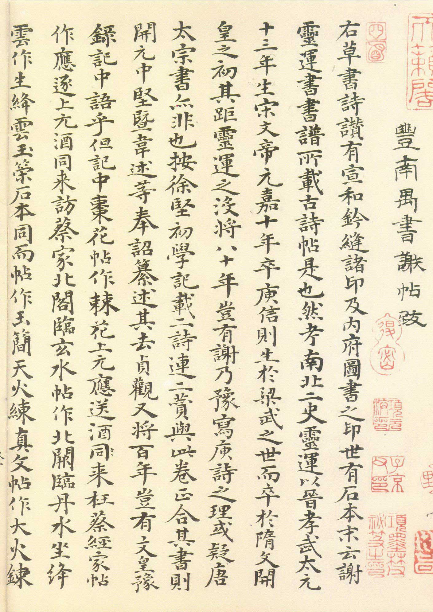 “右草書詩讚,有宣和鈐縫諸印及內府圖書之印。世有石本,末雲謝靈運書。《書譜》所載古詩帖是也。然考南北二史,靈運以晉孝太元十三年(388)生,元嘉十年(433)卒。庾信則生於梁武之世,而卒於隋文開皇之初(581),其距靈運之沒將八十年,豈有謝乃豫寫庾詩之理?或疑唐太宗書,亦非也。按徐堅《初學記》載二詩連二贊,與此卷正合。其書則開元中(徐)堅暨韋述等奉詔篡述,其去貞觀又將百年,豈有文皇(唐太宗李世民)豫錄記中語乎?但記中“棗花”,帖作“棘花”。“上元應送酒,同來蔡經家”,帖作“應逐上元酒,同來訪蔡家”。“北臨玄水”,“作北闕臨丹水”。“坐絳雲”,作“生絳雲”。“玉策”石本同而帖作“玉簡”。“天火練真文”,帖作“大火練真文”。“難以之百年”,帖作“難之以萬(按應為百)年”。“登雲天”,帖作“上登天”。“愛清淨”,帖作“復清曠”。冀見作既見。繽翻作紛�。岩下一老翁五少年贊,帖“五”上有“四”字。以鍛語工拙較之,則帖為優,記乃木刻傳寫訛耳。竊詳是帖,行筆如從空中擲下,俊逸流暢,煥乎天光,若非人力所�。有庾稚恭、王子敬之遺趣。唐人如歐、孫、旭、素皆不類此。唯賀知章千文、孝經及敬和上日等帖氣勢仿佛。知章以草得名,李白、溫庭筠詩皆稱之。竇�獺妒楦場肥鮒�尤詳,季真棄官入道在天寶二年(743),是時《初學記》已行,疑其雅好神仙,目其書而錄之也。又周公謹(即元代周密)《雲煙過眼集》載趙蘭坡與�ニ�藏有賀知章古詩帖,豈即是歟?然東沙子謂卷有神龍等印甚多,今皆刮滅。昔米老雲:古帖多前後無空紙,乃是剪去古印以應券也。今人收貞觀印縫帖若粘著字者,不復入開元御府,蓋貞觀至武后時,朝廷無紀,駙馬貴戚概請得之,開元購時剪不去者不敢出入也。米又雲:陳賢草帖奇逸如日,本書亦有唐氏雜跡,字印與此卷正同,意其實六朝人書。余按陳時庾信在周,南北為敵,未嘗相通,山林諸集書畫皆明著其目,茲獨不然何歟?元章、長睿又皆嘗雲:秘閣所收務博,真贗相混,然則《書譜》所紀可盡信耶?石刻自子晉贊後,闕十九行,僅於“謝靈運王”而止,卻讀“王”為“書”字。又偽作沈傳師跋於後,傳師以行草鳴於時,豈不識王書二字耶?抑東沙子(指收藏家華夏)以唐初諸印證之,而卷後亦無蘭坡、草窗等題識,則余又未敢必其為賀(知章)書矣。俟博雅者定之。嘉靖己酉(1549)中元節獲觀於東沙真賞齋,因考其本末,系之以贊。東沙子者錫山華氏夏、字中甫,所藏鍾(繇)《東武》、《薦季直表》,王右軍《袁生帖》,王方慶《萬歲通進天帖》,顏文忠《劉中使帖》並此卷,皆天下奇寶,贊曰:邈彼列仙,吾聞其語。玄風載闡,前謝後庾。徐韋篡記,草聖傳豪,墨余星彩,筆自空拋。霜乾孤標,春林揚耀。變態流雲,爭工大造。仙書仙事,匪人可能,信本寒險。虔禮鉤繩,顛張狂素,亂離斯鼓。孰從心欲,而不逾矩。宣政璽藏,書譜名錄。真賞珎珍,錦褾玉軸。鄞(音銀)豐道生撰書。