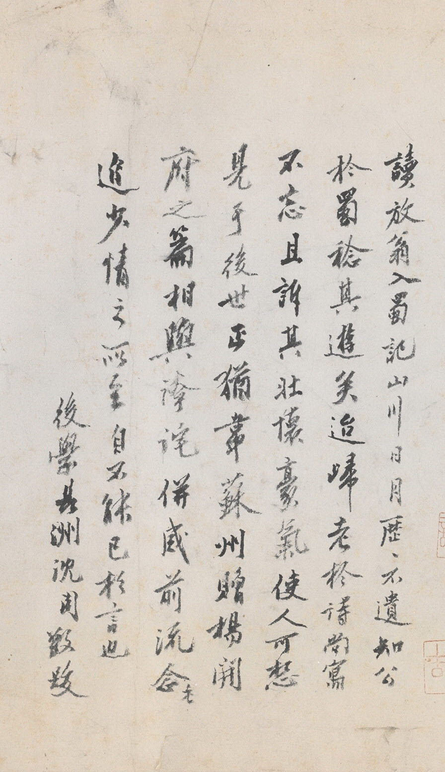 書法欣賞魏晉書法唐朝書法宋朝書法元朝書法明朝書法清朝書法近現代書法字典網>> 歷代書法>> 明朝>> 沈周·跋陸游《懷成都十韻詩卷》正文 沈周·跋陸游《懷成都十韻詩卷》作者:沈周 書體:行書 沈周跋陸游《懷成都十韻詩卷》,行草書,縱34.6cm。故宮博物院藏。沈周的相關書法作品:沈周·自題《為祝淇作山水軸》 沈周《行書自作詩卷》 沈周·跋陸游《懷成都十韻詩卷》 沈周《行書落花詩扇》 沈周《行書落花詩扇葉》 沈周《聲光帖》 沈周·行書詩卷 沈周·跋陸游自書詩卷 沈周《為漢文書扇》 相關文章:陳鵬年《行書八言聯》 (行書)陳鵬年《行書八言聯》台北何創時書法藝術基金會藏釋文:玉樹紫芝丹鳳結彩,琪花綠竹黃...董其昌《勤政勵學箴》 (楷書)董其昌《楷書勤政勵學箴》,縱214.5厘米,橫61.8厘米,現藏遼寧省博物館。釋...包世臣楷書《贈與九楷書軸》 (楷書)包世臣《贈與九楷書軸》紙本楷書 蘭千山館藏【資料來源】《中國書法全集》第76卷-...白蕉《書法十講》第六講 結構問題 (不詳)現在講到結構問題。結構就是講點劃、位置、多少、疏密、陰陽、動靜、虛實、展促、顧盼...北魏太武帝東巡碑 (隸書)北魏太武帝東巡碑,碑額原題《皇帝東巡之碑》,酈道元《水經注》卷十一滱水注徐水條稱...董其昌楷書《金剛經》 (楷書)罕見明代大書法家董其昌楷書欣賞《金剛經》(無缺字本),主編:楊璐,中國書店出版社...王鐸草書《為葆光張老親翁書》詩卷 (草書)王鐸草書《為葆光張老親翁書》詩卷 1065年作 縱30厘米 橫364.5厘米 北...蘇轍《春寒帖》 (行書)蘇轍《春寒帖》,約1089年(元祐四年),行書,紙本,縱25.2厘米,橫24.2...唐寅行書《花下酌酒歌扇面》 (行書)唐寅《花下酌酒歌扇面》紙本行書 30.2×32.9cm 上海博物館藏 釋文:九...武威漢簡·儀禮簡 (隸書)中國甘肅省武威市漢墓中出土的簡牘。統稱武威漢簡。1959年,人們在武威磨嘴子墓群...
