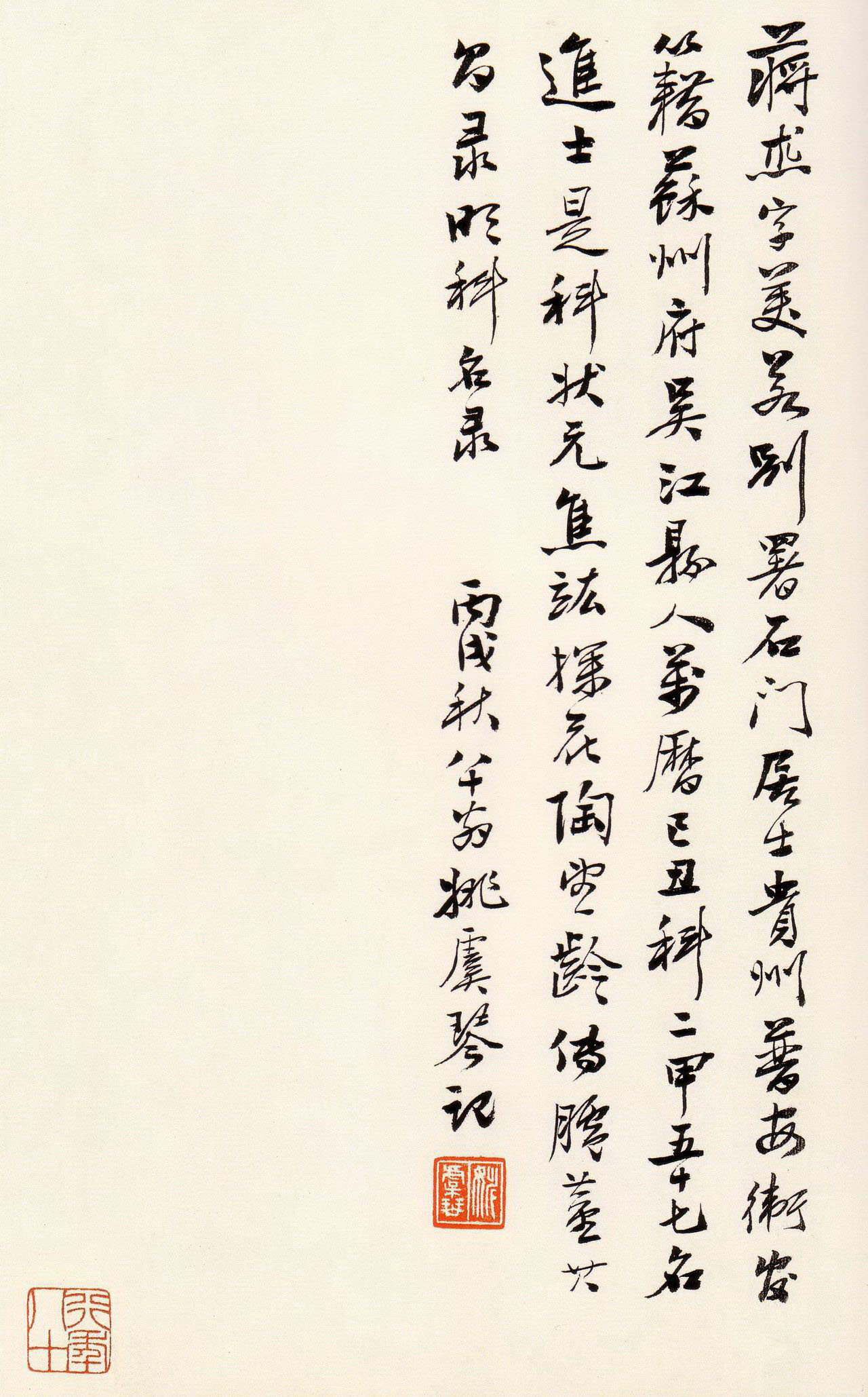 書法欣賞魏晉書法唐朝書法宋朝書法元朝書法明朝書法清朝書法近現代書法字典網>> 歷代書法>> 明朝>> 蔣傑·行草登岱詩(11)正文 蔣傑·行草登岱詩(11)作者:蔣傑 書體:行草 姚虞琴後跋首 頁 上一頁 2 3 4 5 6 7 8 9 10 11 相關文章:唐寅《行書與若容手書冊》 (行書)唐寅《行書與若容手書冊》紙本行書 27.3×64.1cm 美國大都會藝術博物館...蘇遲·跋懷素《自敘帖》 (行書)蘇遲跋懷素《自敘帖》,藏台灣故宮博物院。薄紹之行書《宋給事中丹陽薄紹之書》 (行書)《淳化閣帖》卷八引《宋給事中丹陽薄紹之書》:“知弟定欲回換住止周鏇, 江參軍 甚...唐人寫經小楷《兜沙經》 (小楷)唐《兜沙經》紙本 12開 每頁24×10cm 北京故宮博物院藏 “兜沙經”,冊...范成大行草《中流一壺帖》 (行草)范成大《中流一壺帖》紙本 行草書 31.8×42.4cm 北京故宮博物院藏釋...乾隆御筆《斗鹿賦》 (行書)乾隆在《斗鹿賦》中體現出三個重要的文學價值:一是體現出乾隆聖心天眷的仁義之心;二...文徵明·行書自作詩卷 (行書)釋文立春進賀。王殿千官拜冕旒,紫衣京兆在前頭。四時盛德初臨木,先日嚴寒已送牛。氣...許光祚·蘭亭圖並書序卷 (行書)明 許光祚《蘭亭圖並書序卷》,綾本,設色,縱27厘米,橫136.1厘米,故宮博物...李邕行書《久別帖》 (行書)李邕行書 書法欣賞《久別帖》(宋拓)釋文:“久別,懷仰增深,即日奉。惟動靜安勝。...倪元璐《行草書體秋之一五言詩軸》 (行草)倪元璐《行草書體秋之一五言詩軸》紙本行草書 158×73.5cm 西泠印社藏 ...
