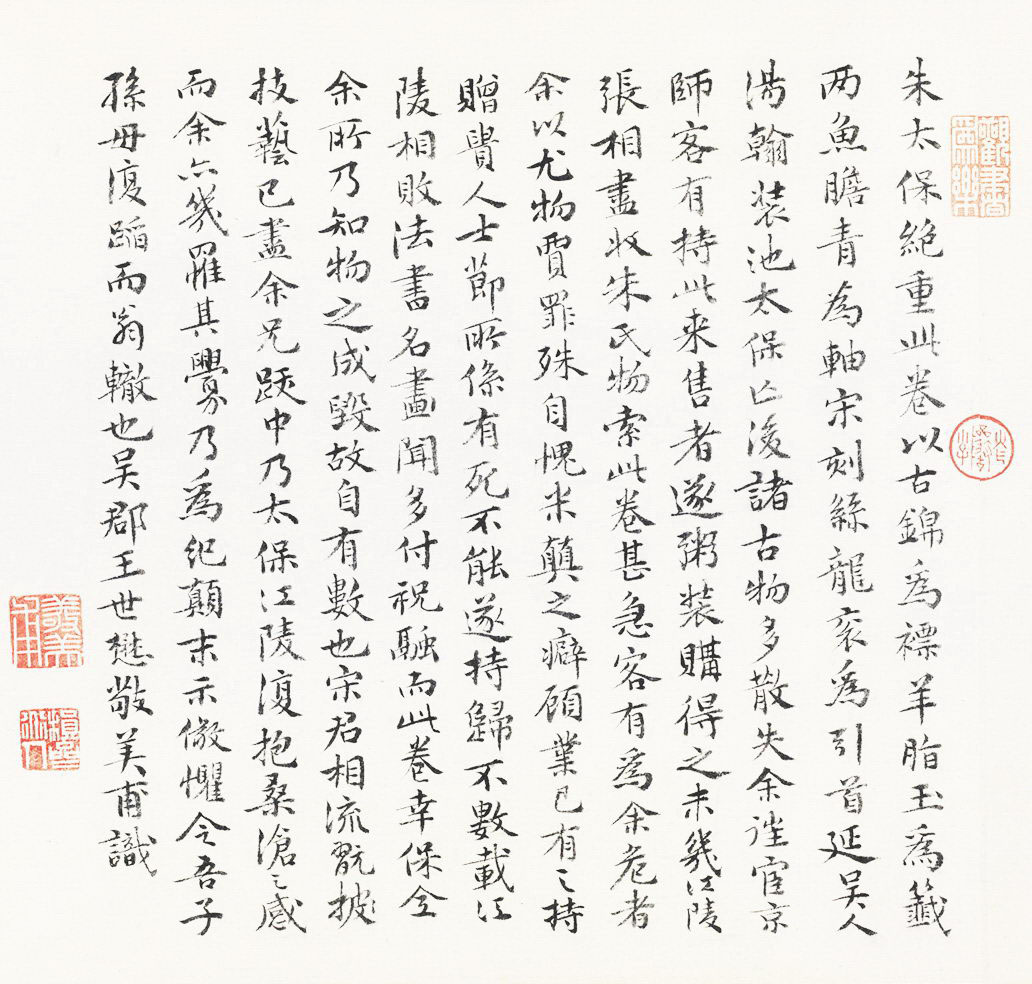 書法欣賞魏晉書法唐朝書法宋朝書法元朝書法明朝書法清朝書法近現代書法字典網>> 歷代書法>> 明朝>> 王世懋·跋趙佶《雪江歸棹圖卷》正文 王世懋·跋趙佶《雪江歸棹圖卷》作者:王世懋 書體:楷書 王世懋跋趙佶《雪江歸棹圖卷》,楷書,縱:30.3厘米。北京故宮博物院藏。相關文章:包世臣行草《錄內史與謝尚書書軸》 (行草)包世臣《行草書錄內史與謝尚書書軸》紙本行草書 132×55.5cm 山西省博物...倪元璐行楷《秋窗月墮七言詩句立軸》 (行楷)倪元璐《秋窗月墮七言詩句立軸》紙本行楷書 121.9×28cm 遼寧省博物館藏...丁敬隸書《五律詩軸》 (隸書)丁敬《隸書五律詩軸》紙本隸書 北京故宮博物院藏 釋文:遠塔見亭亭,晴光...張瑞圖《行草書前赤壁賦》 (行草)張瑞圖《行草書前赤壁賦》捲雲母箋 上海韓天衡氏私人藏張瑞圖行草書《前赤壁賦》簡介...怎樣臨習《禮器碑》 (不詳)《禮器碑》是東漢隸書成熟時期的代表作,在漢隸巾較為規範,是學習隸書的最佳範本之一...米芾·聞張都大宣德尺牘 (行草)【釋文】聞張都大宣德,權提舉榆柳局在杞者。儻蒙明公薦此職,為成此河事致薄效何如。...米芾《拜中嶽命作》 (行書)【釋文】拜中嶽命作。芾二。雲水心常結,風塵面久盧。重尋釣鰲客,初入選仙圖。鼠雀真...祝允明草書《桃源圖詩冊》 (草書)明代祝允明草書作品欣賞《桃源圖詩冊》紙本,38開,每開28.2×16.5cm,...文徵明《草書七律立軸》 (草書)草書七律立軸 見於中國嘉德國際拍賣有限公司2005春季拍賣會中國古代書畫專場尺 ...李陽冰篆書《般若台銘》 (篆書)李陽冰《般若台銘》 篆書,高近4米,寬近2米,4行,每字長約40厘米。寬25厘米...