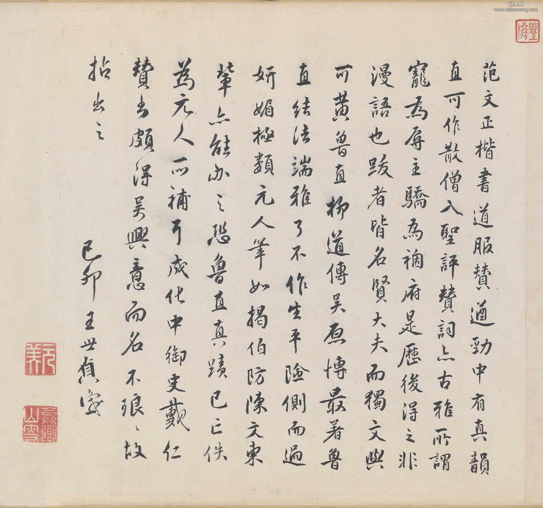 書法欣賞魏晉書法唐朝書法宋朝書法元朝書法明朝書法清朝書法近現代書法字典網>> 歷代書法>> 明朝>> 王世貞·跋范仲淹《道服贊》正文 王世貞·跋范仲淹《道服贊》作者:王世貞 書體:行書 王世貞跋范仲淹《道服贊》,行書,縱34.8cm,北京故宮博物院藏。釋文:範文正楷書道服贊遒勁中有真韻直可作散僧入聖評讚詞亦古雅所謂寵為辱主驕為禍府是歴後得之非漫語也跋者皆名賢大夫而獨文與可黃魯直栁道傳吳原博最著魯直結法端雅了不作生平險側而過妍媚極類元人筆如掲伯防陳文東輩亦能辦之恐魯直真跡已亡佚為元人所補耳成化中御史戴仁贊書頗得吳興意而名不琅琅故拈出之王世貞的相關書法作品:王世貞·跋范仲淹《道服贊》 王世貞·跋柳公權《蘭亭詩》 王世貞·行書手札 相關文章:蘇軾行書《屏事帖》 (行書)蘇軾《屏事帖》 書於1085年(元豐八年) 釋文:宣猷丈丈計已屏事齋居 未敢上狀...趙孟頫《江南淨土詞十二首》 (行書)至元二十三年(1286年),行台侍御史程鉅夫“奉詔搜訪遺逸於江南”,將趙孟頫引見...喜歡閒章嗎,閒章內容大全導讀:閒章,是印章中的一種,是區別于姓名字號章的一類。廣義地講,它濫觴於戰國及秦...祝允明小楷《遠遊二首》 (小楷)祝允明小楷《遠遊二首》冊頁明代書家雖以行草為主,但莫不兼善小楷,如宋克、祝允明、...四大青銅器國寶與書法之緣【導讀】清代晚期,在有“青銅器故鄉”之稱的陝西,出土了毛公鼎、大盂鼎、散氏盤、虢...北魏《李瞻墓誌》 (楷書)此志書法點畫豐腴舒展,結體翔動開張,其字形時有舛誤,殆由石質鬆脆且鐫刻倉促所致,...裴休·圭峰禪師碑 (楷書)《圭峰禪師碑》全稱“唐故圭峰定慧師傳法碑並序”,又名《圭峰定慧禪師碑》,簡稱《圭...李邕楷書《靈岩寺頌並序碑》墨拓 (楷書)李邕《靈岩寺頌並序碑》墨拓 濟南圖書館藏此為濟南圖書館所藏已割裱成冊的拓本,拓本...楷書最難寫的八個筆畫楷書是普及性最大的漢字形式,由此構成的漢字藝術,是相對基礎和規律性較強的書法藝術...謝鐸·跋陸游《懷成都十韻詩卷》 (行草)謝鐸跋陸游《懷成都十韻詩卷》,行草書,縱34.6cm。故宮博物院藏。