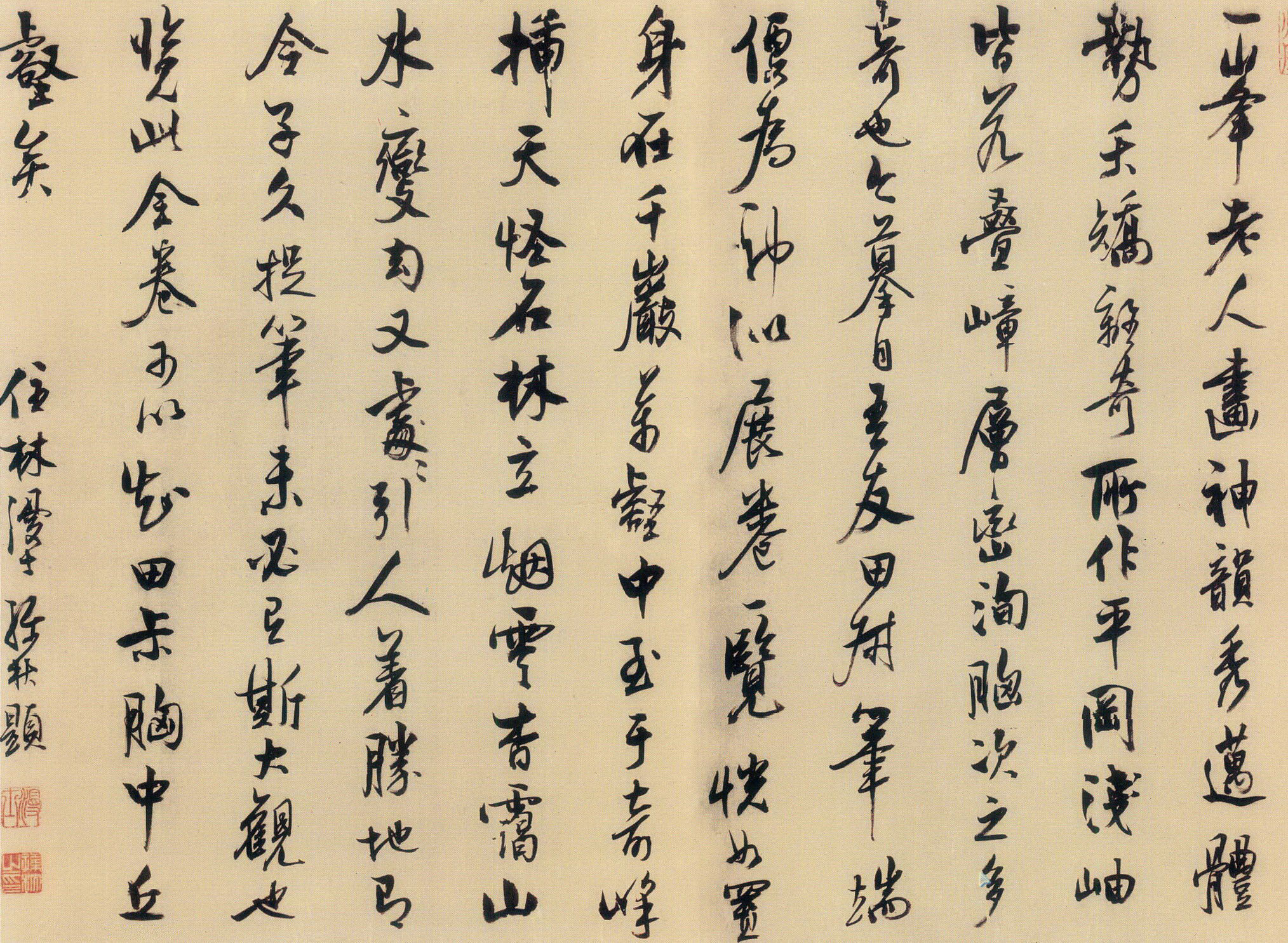 書法欣賞魏晉書法唐朝書法宋朝書法元朝書法明朝書法清朝書法近現代書法字典網>> 歷代書法>> 明朝>> 孫杕·跋藍瑛《仿黃公望山水卷》正文 孫杕·跋藍瑛《仿黃公望山水卷》作者:孫杕 書體:行書 孫杕跋藍瑛《仿黃公望山水卷》,行書。相關文章:王鐸草書《臨王獻之省前書帖軸》之二 (草書)王鐸《臨王獻之省前書帖軸》1647年作 縱164cm 橫50cm 開封市博物館藏...道教經典《太上洞玄靈寶無量度人上品妙經》 (楷書)道教經典《太上洞玄靈寶無量度人上品妙經》 紙本,捲軸。25.5 x 243 cm...破山明《草書七言聯》 (草書)破山明《草書七言聯》 成都杜甫草堂博物館藏釋文:拿雲自不容收放 喝月誰能使到行 ...沈遼·相望顏采帖 (行書)【釋文】在渚中數觀大石刻未嘗不逡巡其下想望顏采及至廬峰見諸禪客道公所得高妙臨機止...歐陽詢《定武蘭亭序》吳炳舊藏本 (行書)宋拓定武蘭亭序吳炳舊藏本 縱26.0厘米 寬66.5厘米 日本國立東京博物館藏傳...徐生翁《又有時見行書七言聯》 (行書)徐生翁《又有時見行書七言聯》 釋文:又有石榴才一幅,時見松櫟皆千圍。辰生先生屬。...李文田《八言聯》 (不詳)釋文: 柳裊長條 松擎紫蓋 葉依黃鳥 花落春池 李文田 李文田《八言聯》,此《八...顧炎武楷書《恭祝子翁詩扇》 (楷書)顧炎武《恭祝子翁詩扇》金箋本行楷書 17×52.4cm 上海博物館藏釋文:經學...唐寅行書《尺牘之一》 (行書)唐寅《尺牘之一》紙本行書 22.6×26.5cm 台北故宮博物院藏 釋文:侍生...李白《上陽台帖》 (行草)《上陽台帖》墨跡,李白書。行草書,5行,24字,有款,款署“太白”二字。帖前隔水...